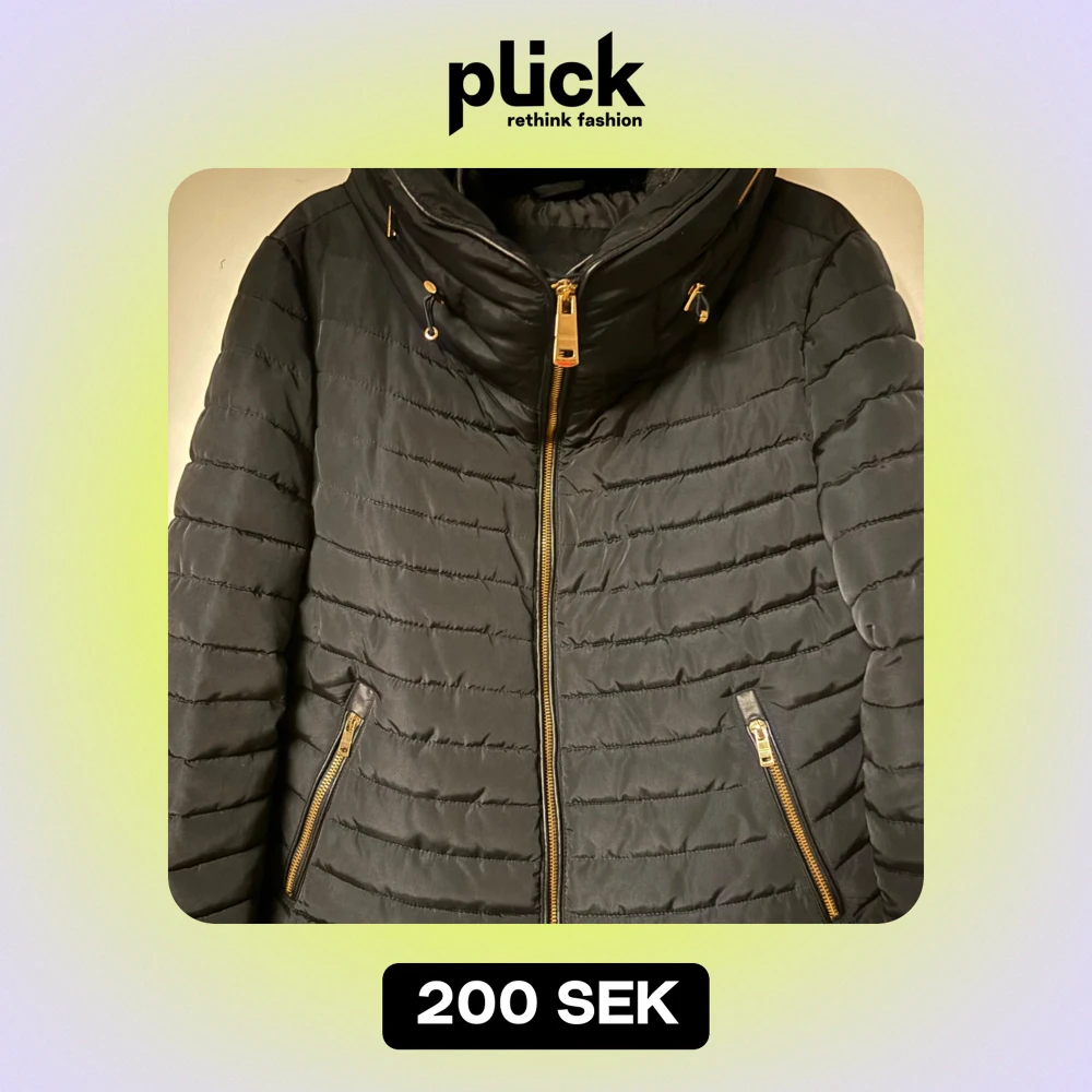 Säljer en snygg svart pufferjacka med gulddragkedjor och hög krage. Perfekt för kalla dagar med sin quiltade design. Jackan har två praktiska fickor med dragkedja. Passar både till vardags och festliga tillfällen. 🖤✨