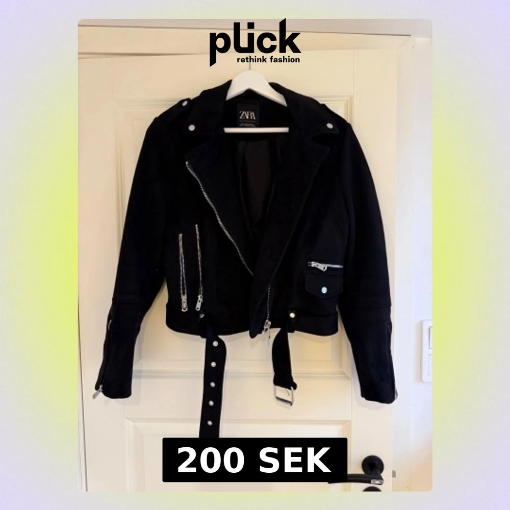 Snygg svart mockajacka från Zara med klassisk bikerstil. Jackan har silvriga dragkedjor, bälte i midjan och flera fickor med detaljer. Croppad modell med långa ärmar.