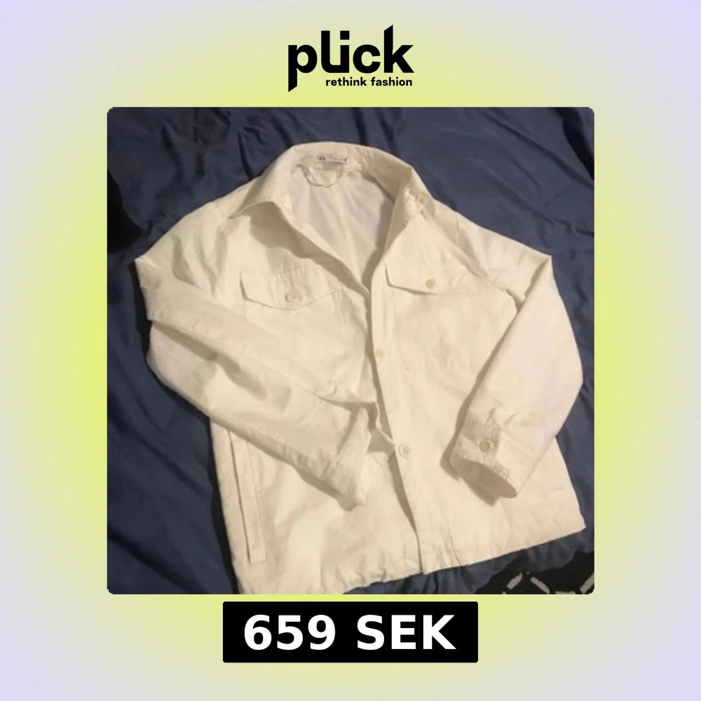 Snygg vit jacka från Zara med klassisk krage och knappar framtill. Jackan har två bröstfickor med lock och knappar, vilket ger en stilren look. Perfekt för vår och sommar. Köpte den för ungefär 3 månader sen för ca 850kr, säljer den pga att de inte är min stil längre.den ser ut så för den har varit i tvätten en gång, men det går att få den se ny ut med strykjärn