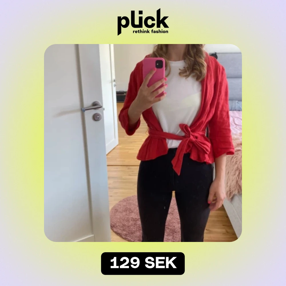 Säljer en snygg röd omlottjacka med trekvartsärmar. Jackan har ett knytband i midjan som ger en fin passform. Perfekt för vår och sommar, och den är i ett lätt och bekvämt material.