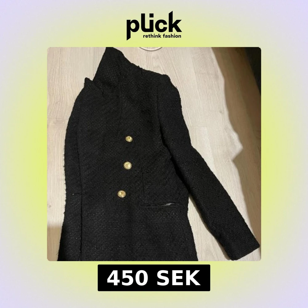 Snygg svart kavaj från Zara med sex guldiga knappar framtill. Jackan har en strukturerad, lite grov yta och klassisk krage. Passar dig som gillar stilrena och trendiga detaljer. Perfekt att styla med jeans eller kjol för en cool look.