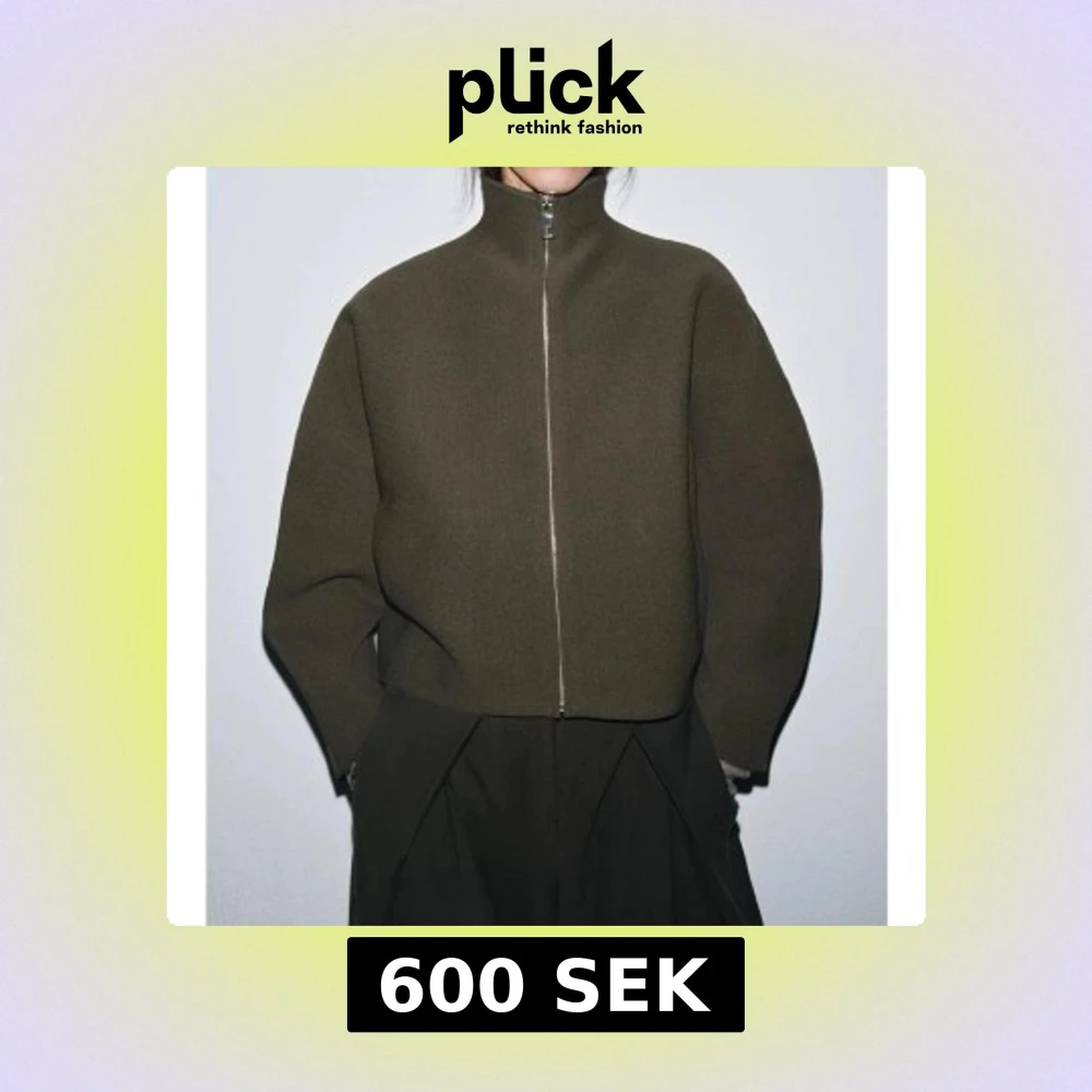Minimalistisk olivgrön jacka med croppad passform och högt krage. Jackan har raka, breda ärmar och en silverfärgad dragkedja framtill. Materialet är tjockt och känns som ull, perfekt för lager-på-lager. Enkel och clean design som ger en cool vibe. endast använd två ggr och därmed ny! den är tjockare också i materialet , nypris 699kr
