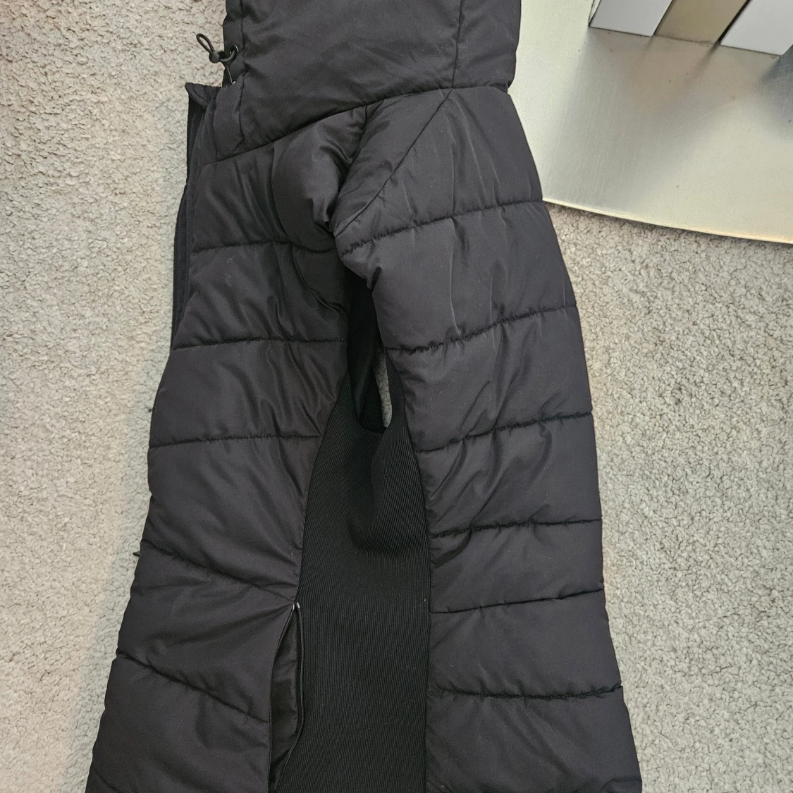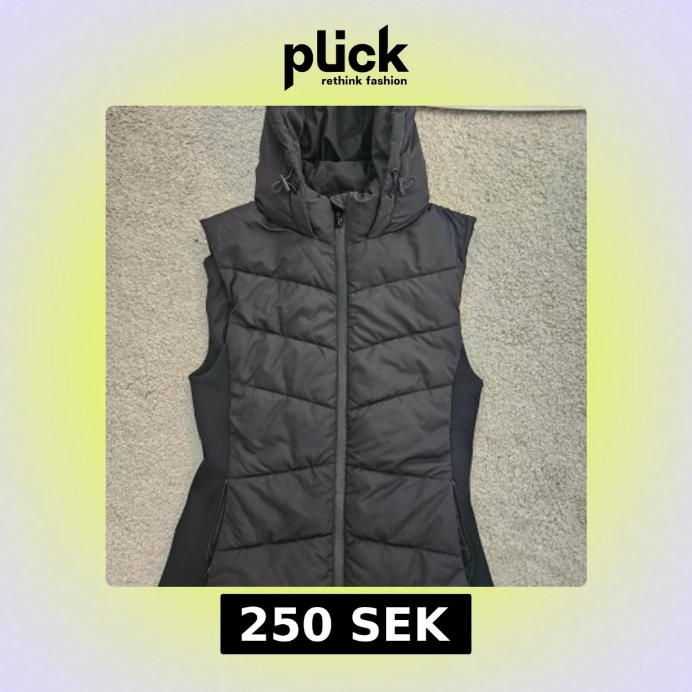Svart quiltad dunväst från Zara med dragkedja framtill och stor huva med dragsko. Västen har en figurnära passform och ribbade sidor för extra komfort. Perfekt för lager-på-lager under kyliga dagar.