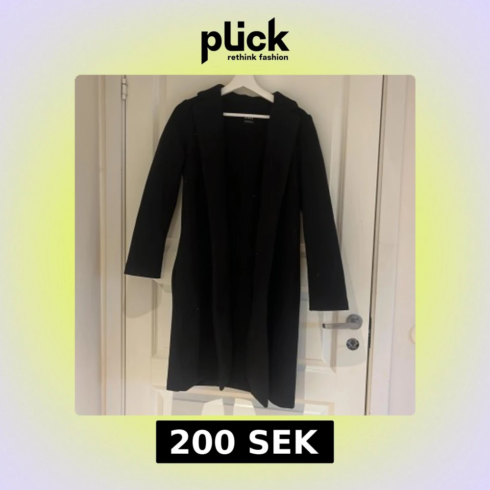 Säljer en svart lång kappa från NA-KD med huva. Klassisk och stilren modell med långa ärmar och öppen framtill. Perfekt för dig som vill ha en enkel och snygg jacka till vardags.