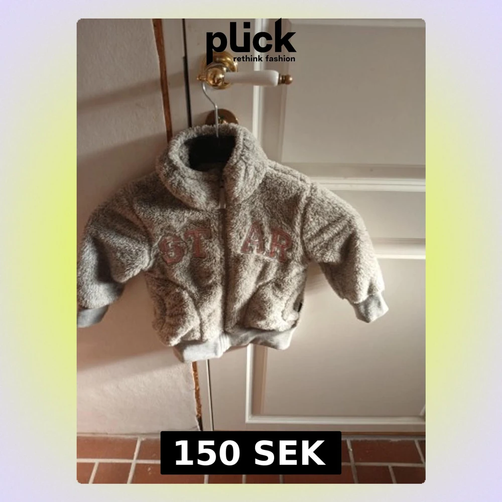 Mysig grå teddyjacka med hög krage och dragkedja framtill. Jackan har broderat STAR-tryck i rött och vitt på bröstet samt ribbade muddar vid ärmslut och nederkant. Perfekt för kyliga dagar och ger en trendig look.