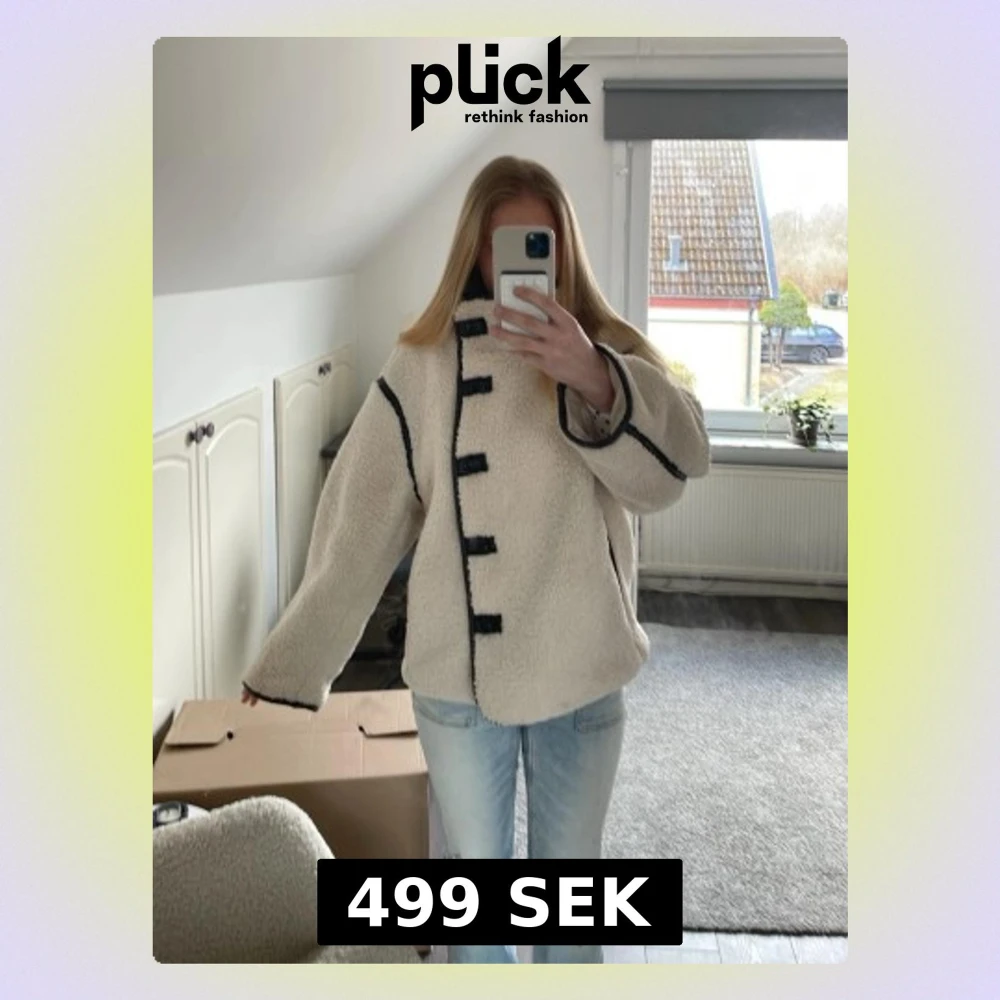 Säljer en oversized beige teddyjacka med svarta kantdetaljer och knäppning framtill. Jackan har breda ärmar och en mysig, fluffig känsla. Perfekt för kalla dagar och ger en trendig look.