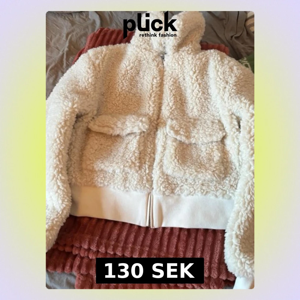 Mysig vit teddyjacka med fluffig textur och huva. Jackan har två stora fickor framtill och dragkedja med ringdetalj. Ribbad mudd nedtill ger en snygg kontrast till det fluffiga materialet. Perfekt för kyliga dagar när du vill vara både varm och stylish.
