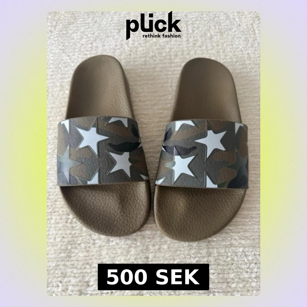 Säljer ett par olivgröna tofflor med bred rem i camomönster och vita stjärnor. Tofflorna har en klassisk slip-in design och är tillverkade i syntetmaterial med struktur på fotbädden för extra komfort. Perfekta för chill dagar hemma eller på stranden.