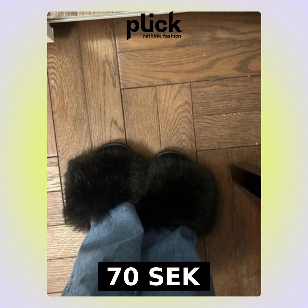 Säljer ett par svarta tofflor med breda, fluffiga band i fuskpäls. Sulan är platt och gjord i syntetmaterial, perfekt för att glida runt hemma med en extra cozy vibe. Tofflorna har en modern och trendig look som passar till chill outfits.