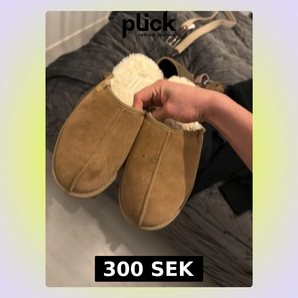 Mysiga beige tofflor i mocka med fluffigt vitt ullfoder. Klassisk slip-in modell som håller fötterna varma under kalla dagar. Perfekta för att chilla hemma och ge en skön känsla. Tidlös design utan synligt märke.
