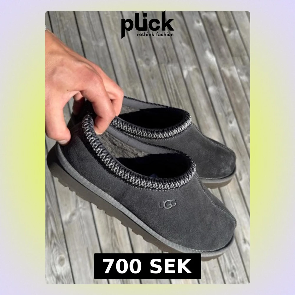Säljer ett par mörkgrå UGG Tasman i mjuk mocka med broderad kant i svart och vitt. Insidan är fodrad med fluffigt material för extra komfort. Perfekta att glida runt i hemma eller utomhus när du vill ha det extra mysigt. Väldigt bra skick. Skriv vid frågor!
