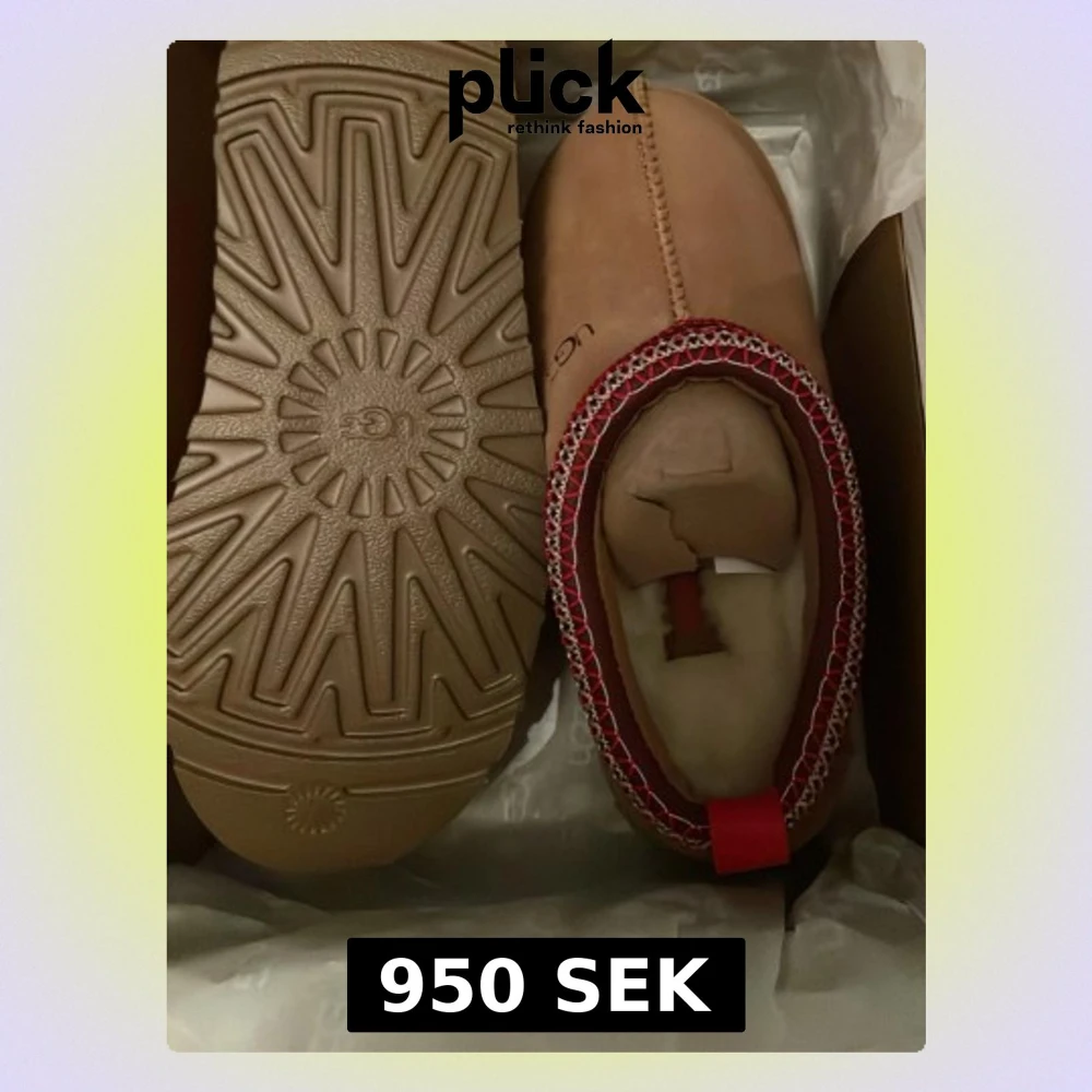 Säljer ett par bruna UGG-tofflor i mocka med tjock sula och mjukt foder. Tofflorna har en snygg röd och vit kant runt öppningen samt en röd hälflik. Perfekta för att hålla fötterna varma och stilrena hemma.