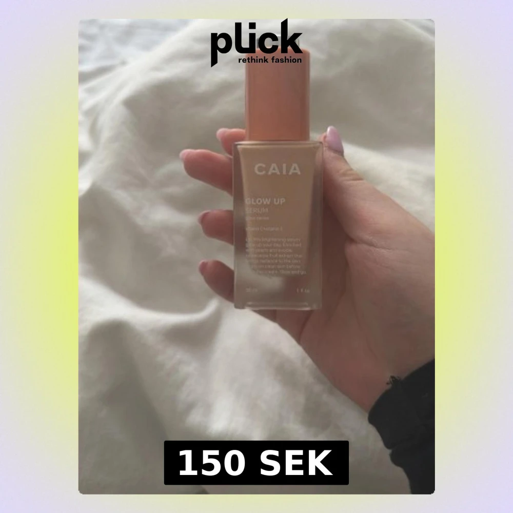 Säljer en CAIA Glow Up Serum toner i en snygg glasflaska med persikofärgat lock och silvrig detalj. Tonern har en ljus beige nyans och innehåller vitamin C och E för extra lyster. Flaskan rymmer 30 ml och har en modern, stilren design. Endast testad