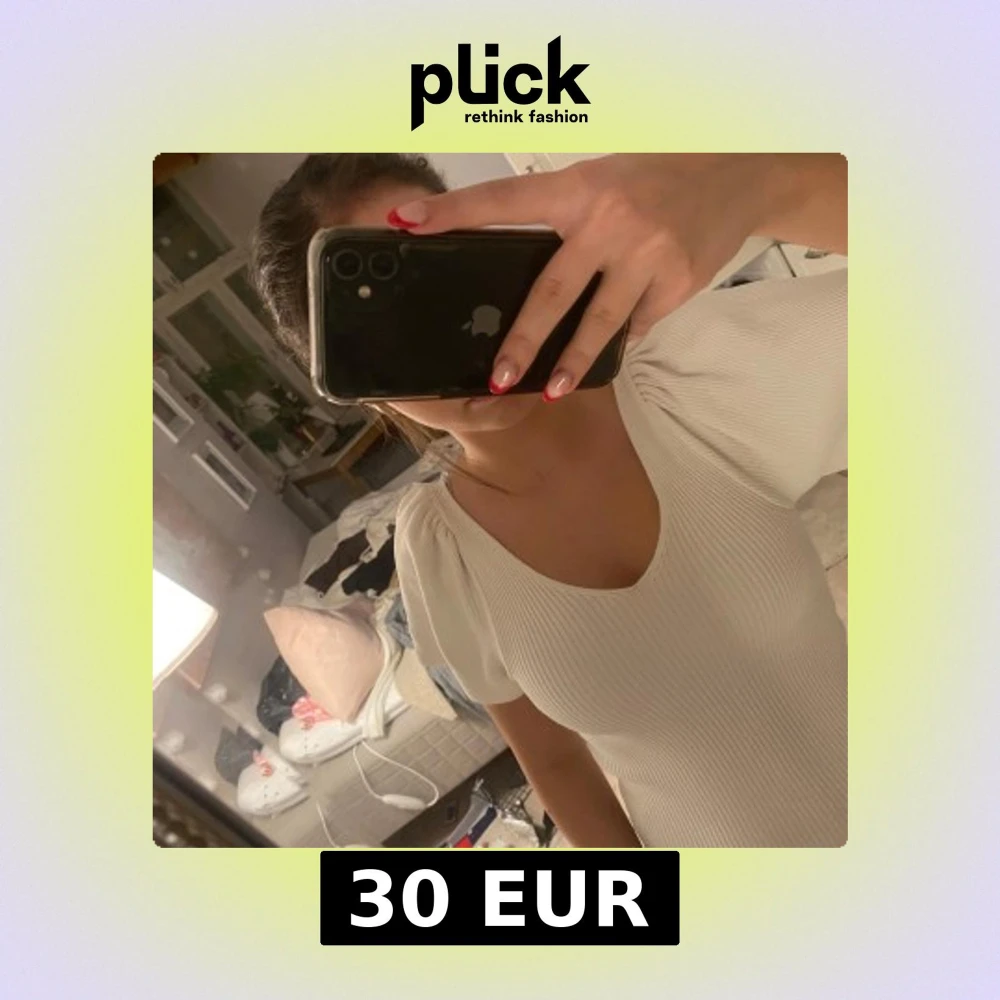 Säljer en stilren vit ribbad topp med korta puffärmar och v-ringning. Perfekt för en chic och enkel look.