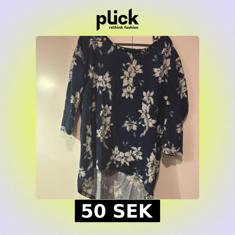 Säljer en vacker blommig blus i blått med vita blommor. Blusen har trekvartsärmar och en lös passform, perfekt för vår och sommar. Den är tillverkad i ett mjukt och bekvämt material.