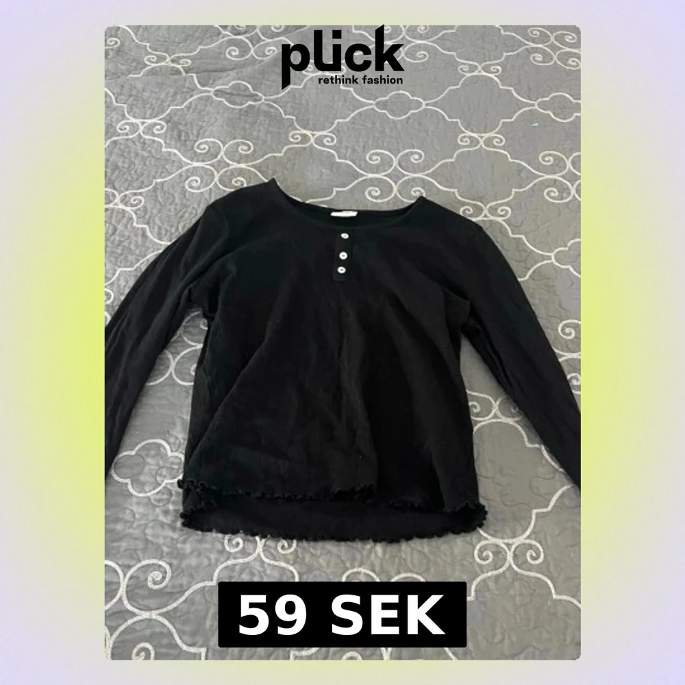 En svart långärmad topp med rund hals och tre vita knappar framtill. Lite genomskinlig o kort. Toppen har en lätt vågig kant nertill och är gjord i mjukt bomullstyg. Enkel och stilren design som passar till mycket.