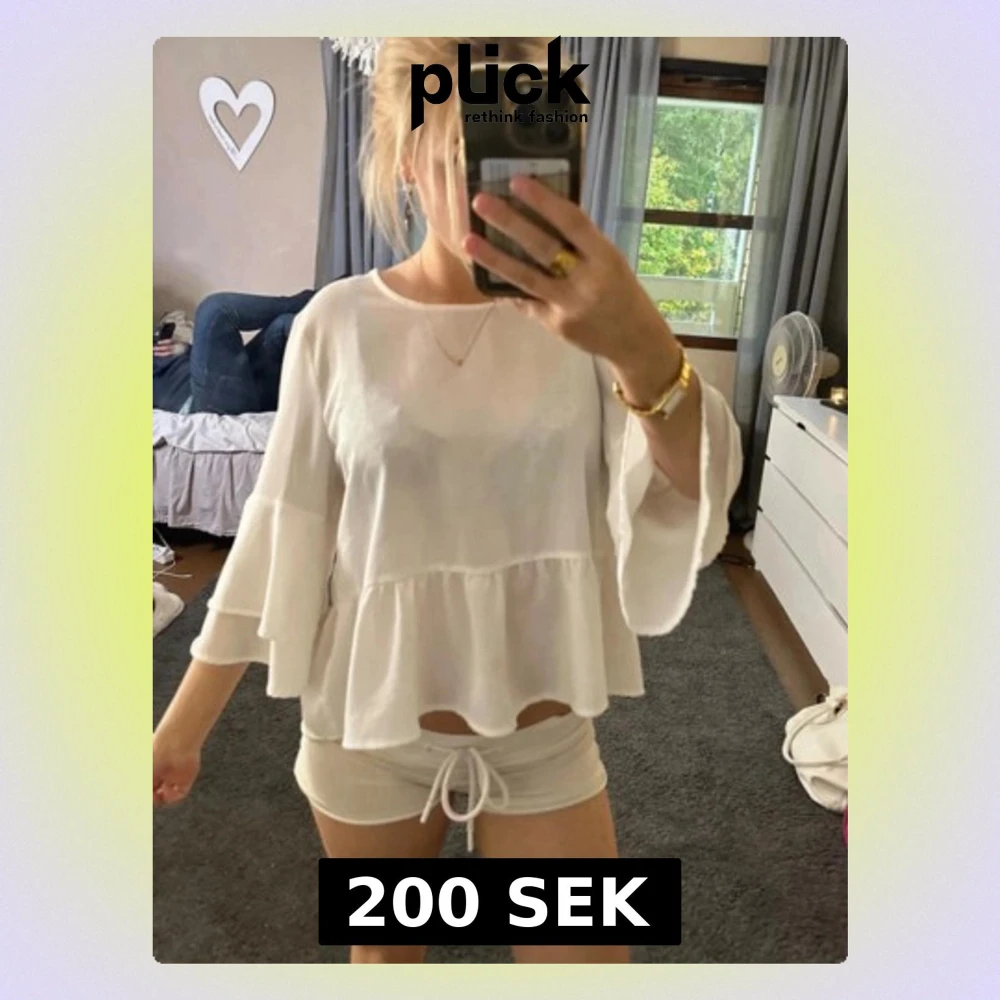 Säljer en luftig vit blus med volangdetaljer och vida, långa ärmar. Blusen har en lös passform.
