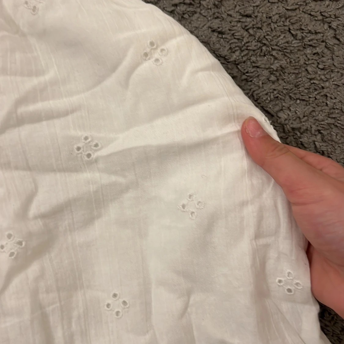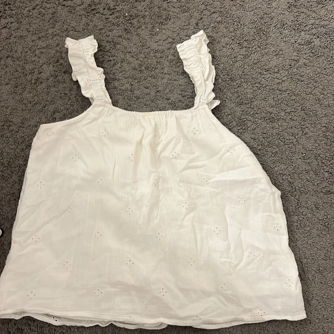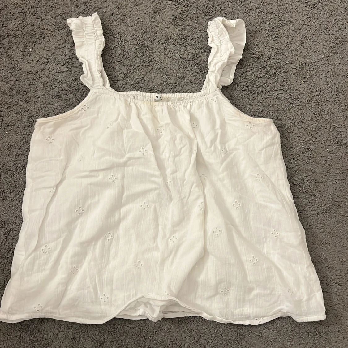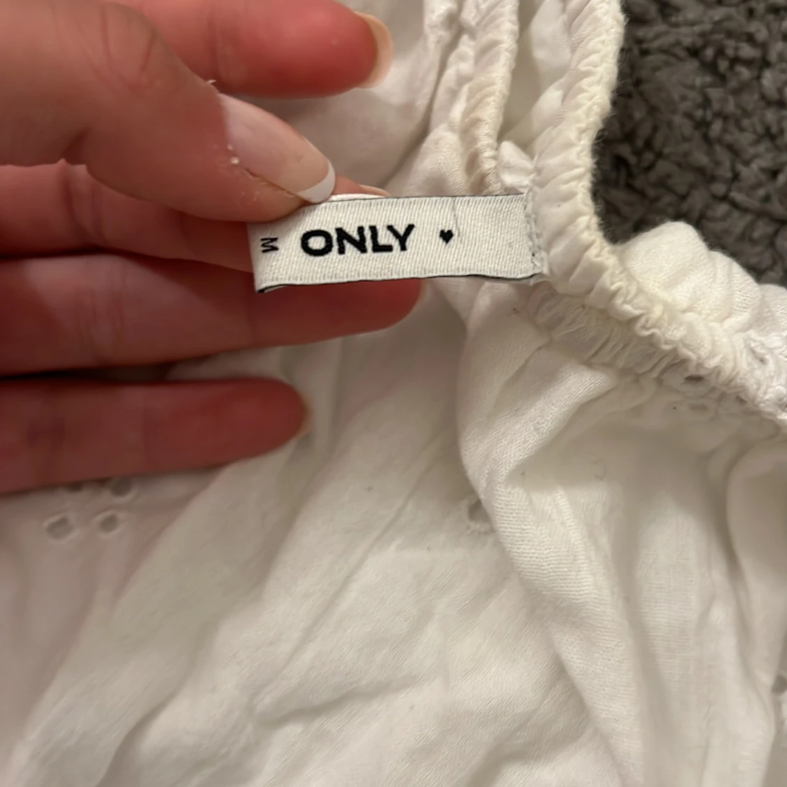 Supersöt vit linnetopp från ONLY med broderade små blommor och volangprydda axelband. Toppen är ärmlös och har en luftig passform, perfekt för varma dagar. Materialet känns mjukt och lätt mot huden. Säljes i storlek M!
