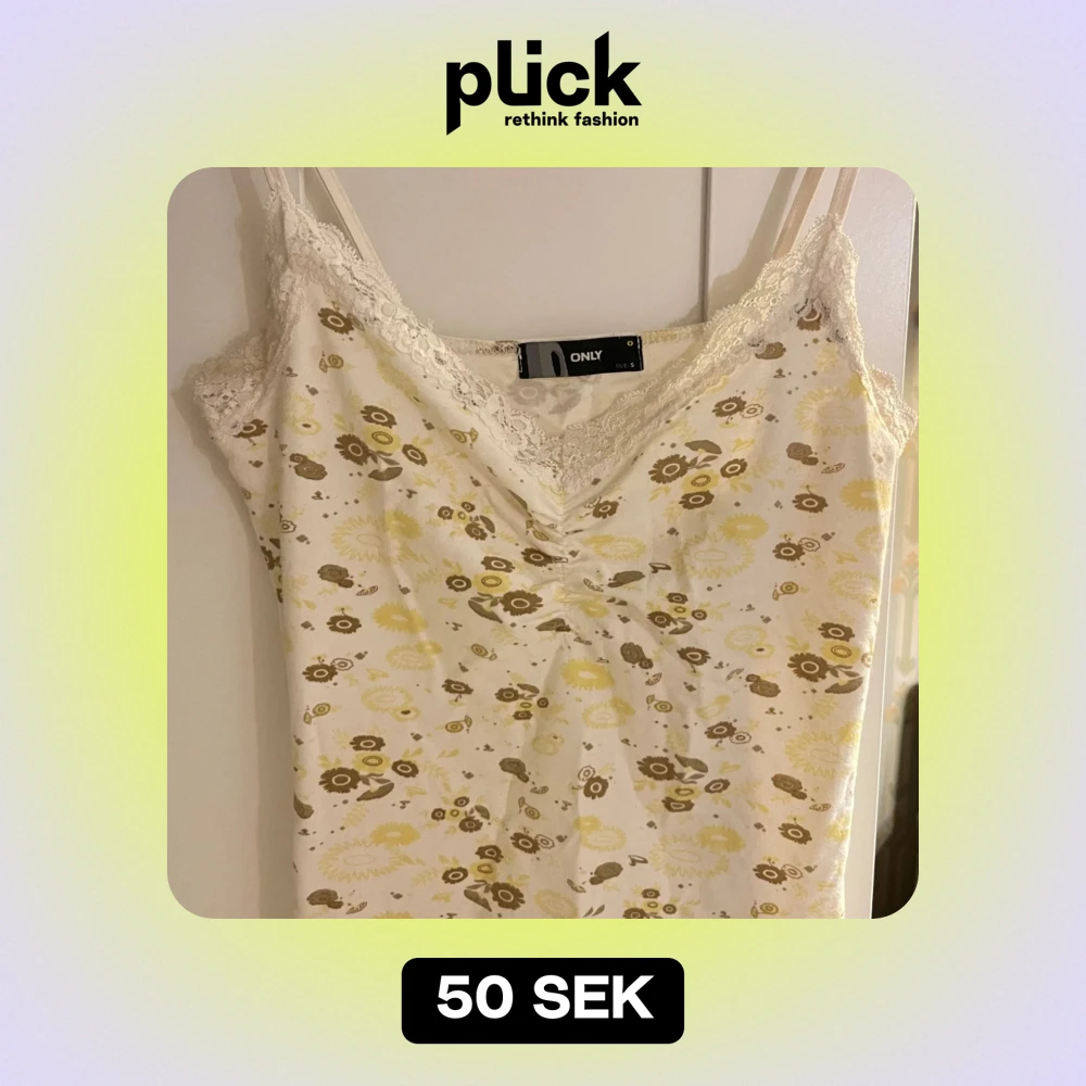 Säljer ett sött linne från ONLY i storlek S. Det är vitt med ett gulligt blommönster i gult och brunt. Linnet har spetsdetaljer vid halsringningen och smala axelband. Perfekt för sommardagar!