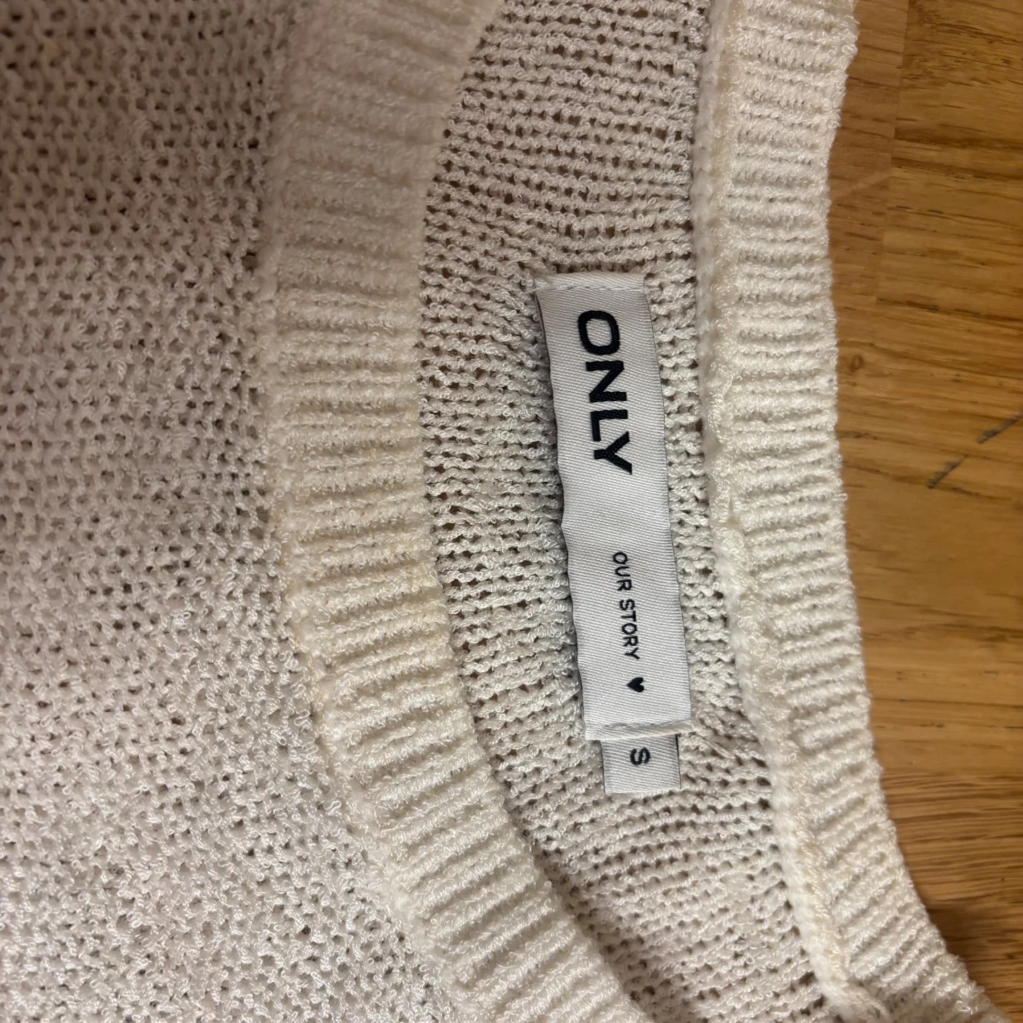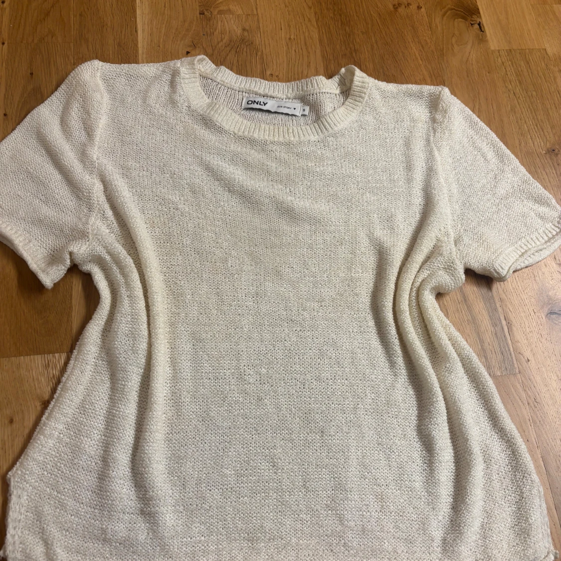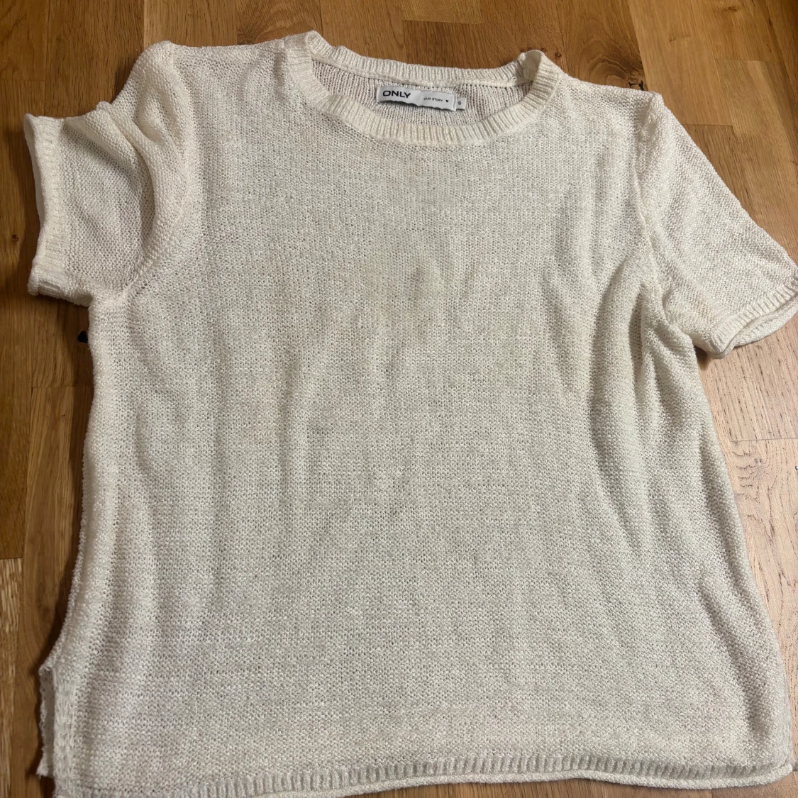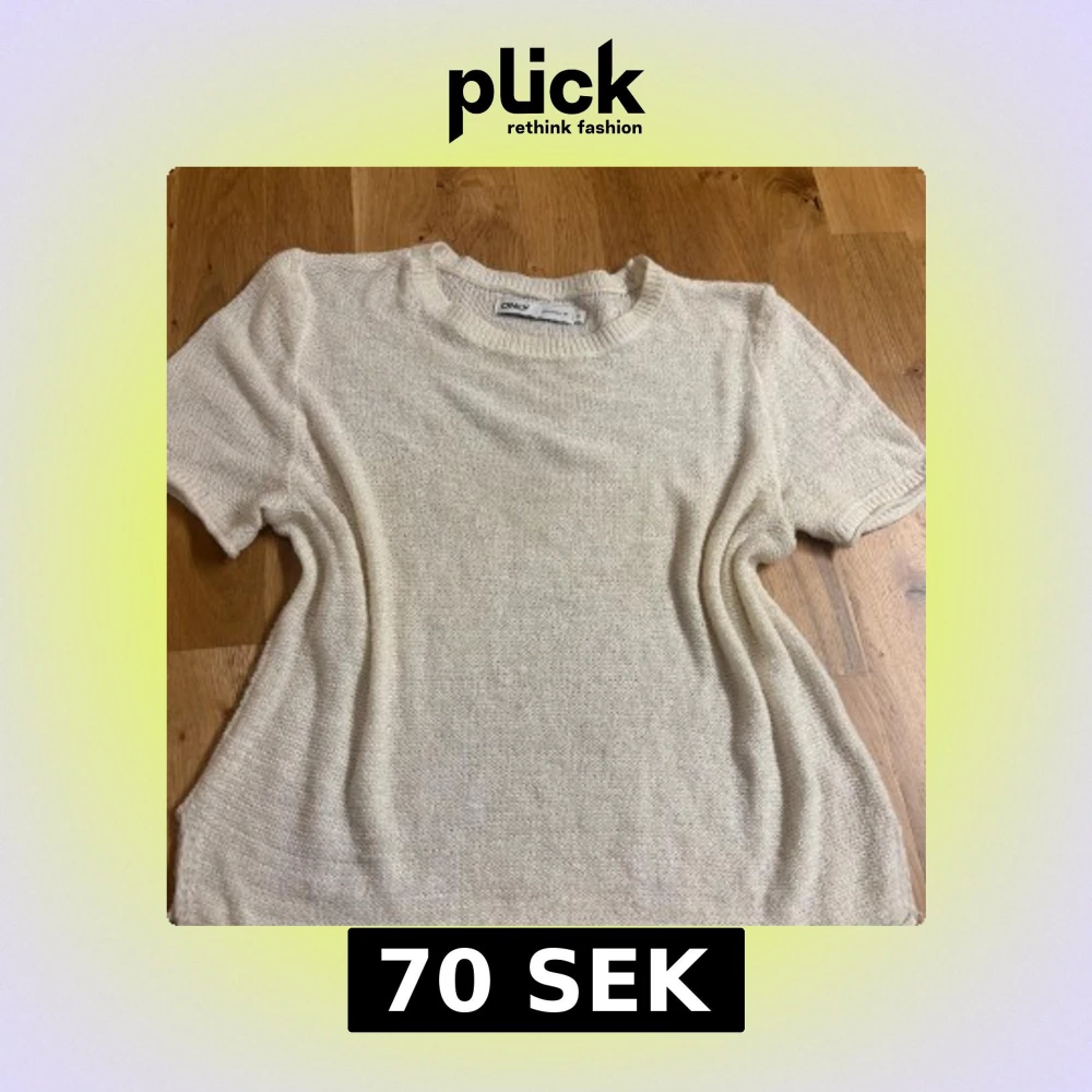 En enkel och stilren beige stickad topp från ONLY. Modellen har rund halsringning, korta ärmar och ribbade kanter vid hals, ärmslut och nederkant.