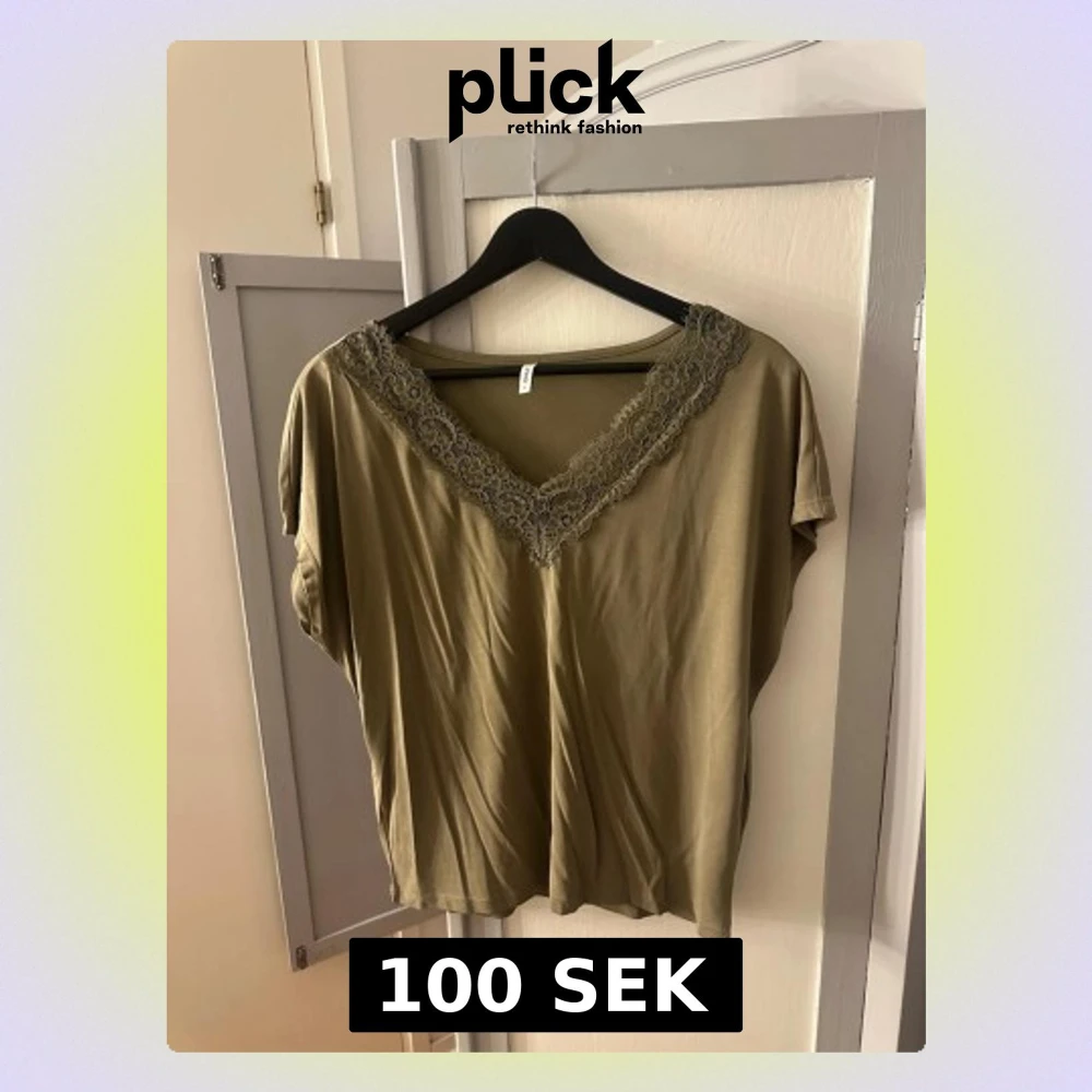 Säljer en olivgrön topp från ONLY med v-ringad spetskant. Toppen har korta ärmar och är gjord i ett mjukt, tunt material som känns skönt mot huden.
