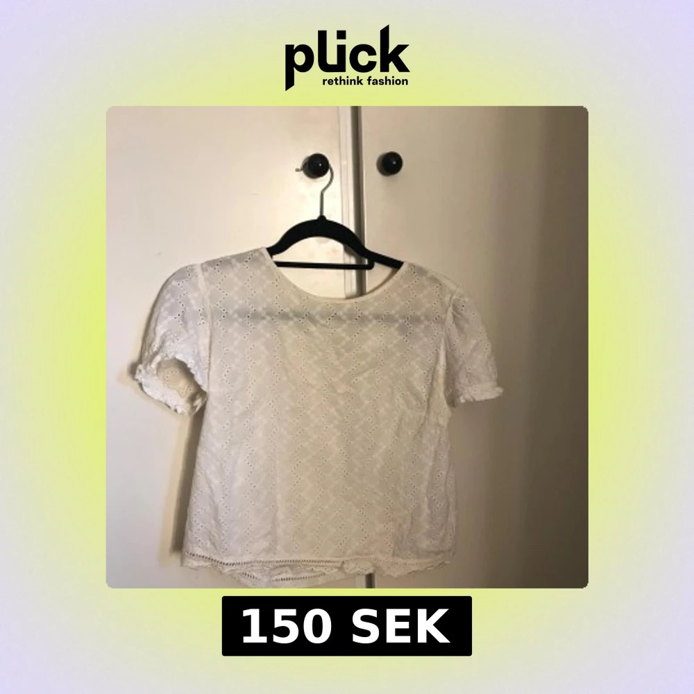Söt vit blus i bomull med broderade detaljer och små hålmönster. Blusen har kort puffärm och rund halsringning fram, samt en subtil v-ringning bak. Perfekt för en fräsch och somrig look.
