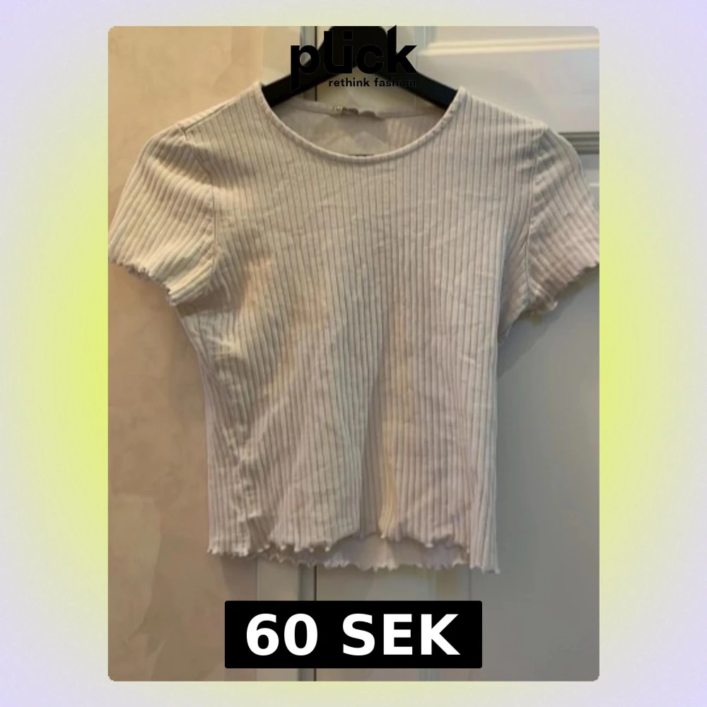 Säljer en vit ribbad topp från ONLY i storlek S. Toppen har korta ärmar, rund halsringning och är croppad med vågig kant nedtill. Perfekt för dig som gillar enkel och stilren design med lite edge.