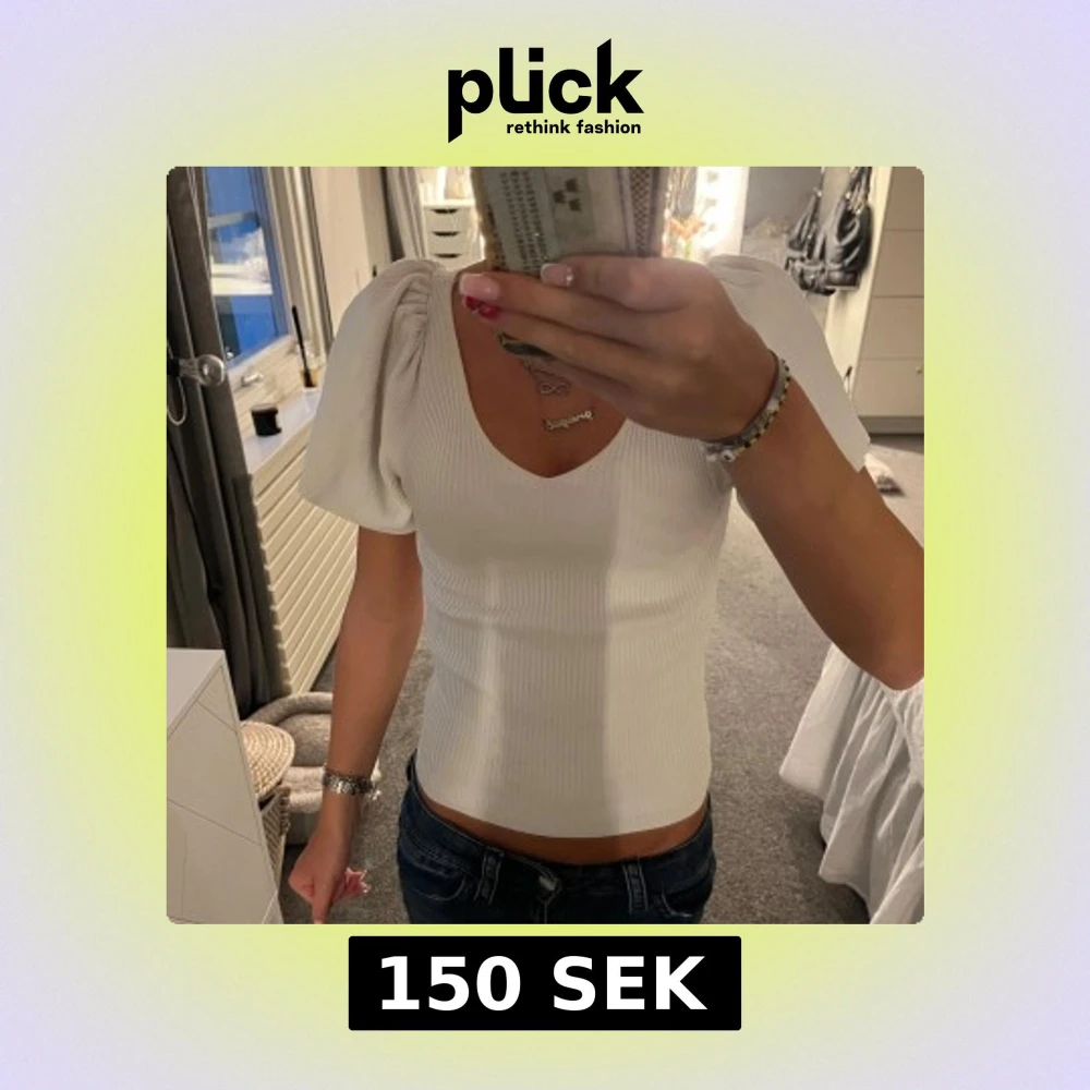 Supersnygg vit ribbad topp från ONLY i storlek XS. Toppen har korta puffärmar och v-ringning som ger en trendig look. Materialet är stretchigt och sitter snyggt på kroppen. Perfekt att styla med jeans eller kjol för en fräsch outfit.