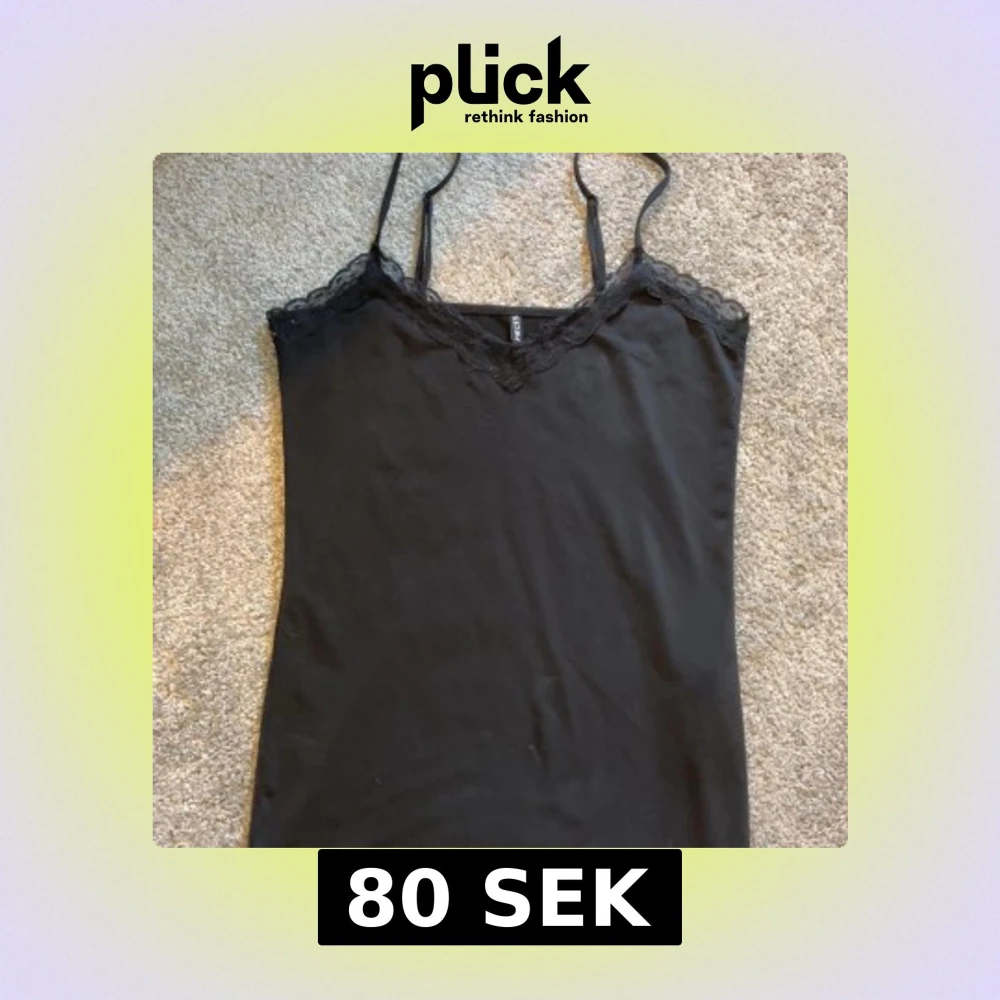 Säljer ett svart linne med smala axelband och v-ringad spetskant upptill. Perfekt att styla till olika outfits och passar året runt. Mjukt material och enkel design.