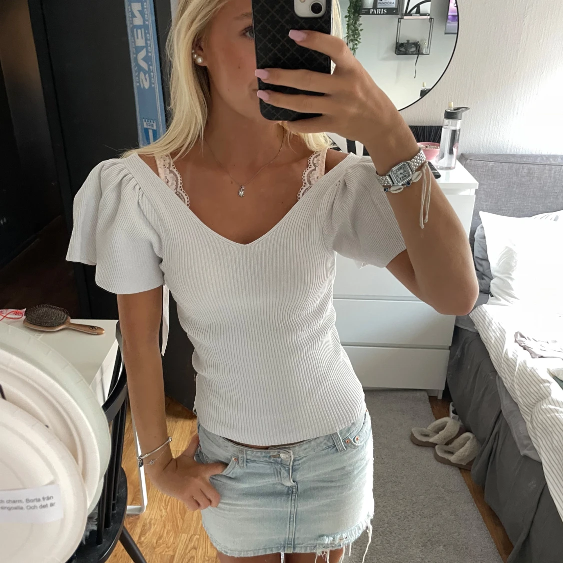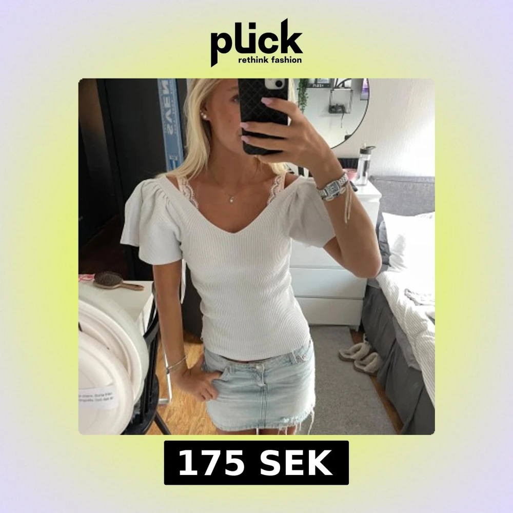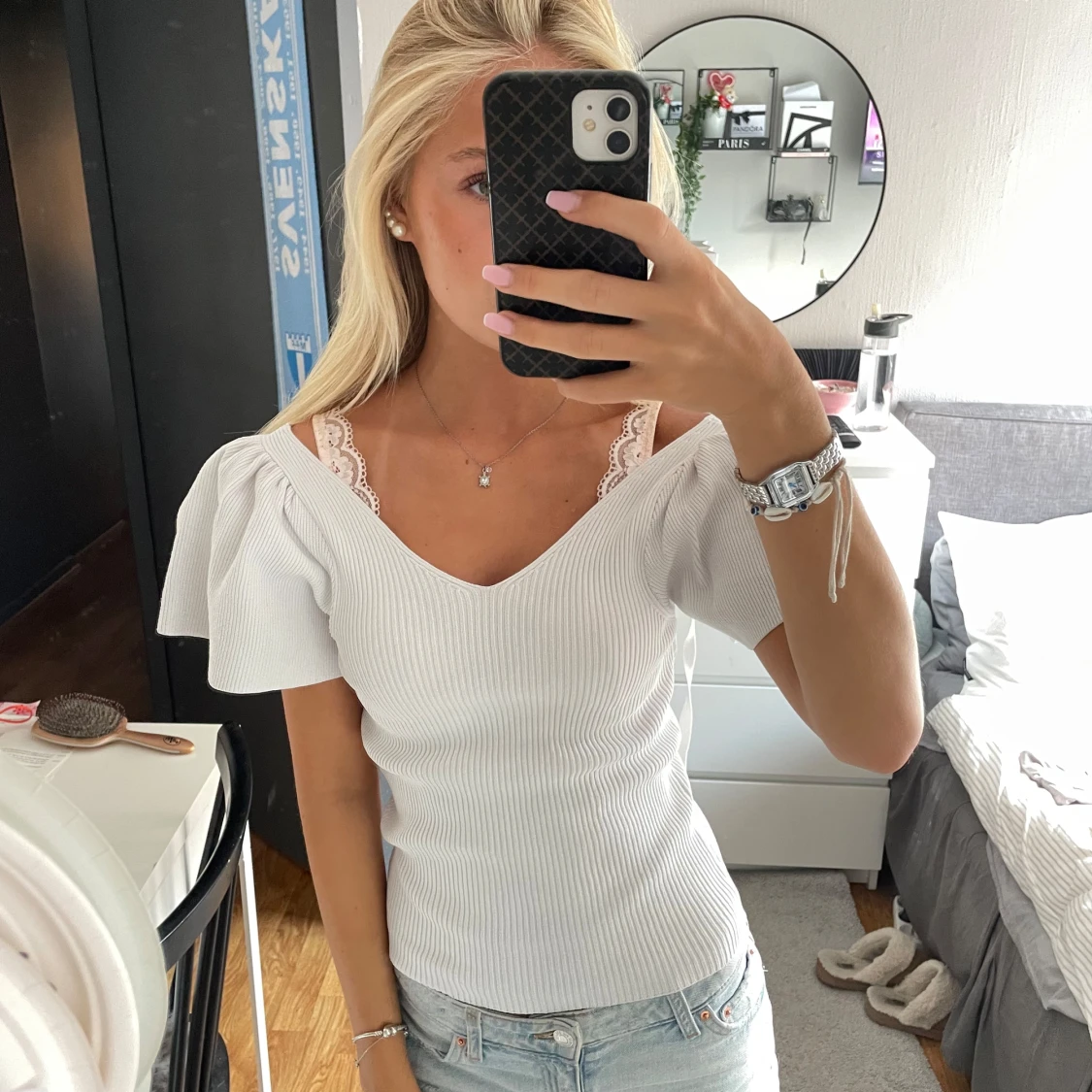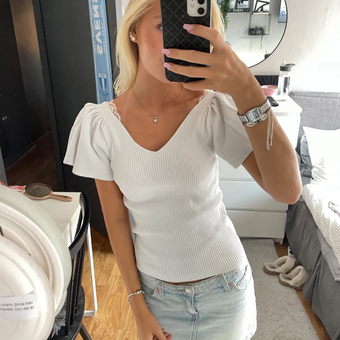 Supersöt vit ribbad topp med v-ringning och korta puffärmar. Sitter figurnära och har en stretchig känsla. Perfekt att styla med kjol eller jeans för en fräsch look. Toppens material är mjukt och följsamt, och den har en modern vibe med sina markerade axlar.
