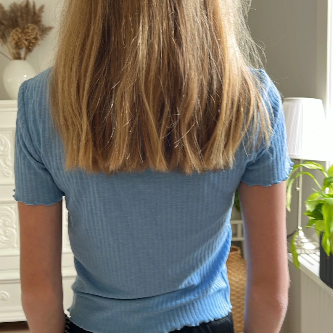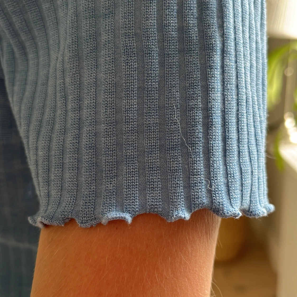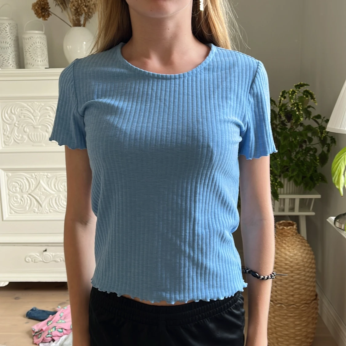 Superfin ljusblå ribbad topp med korta ärmar och rund hals. Toppen har vågiga kanter vid ärmslut och nederkant som ger en söt touch. Perfekt till jeans eller kjol för en chill och trendig look.