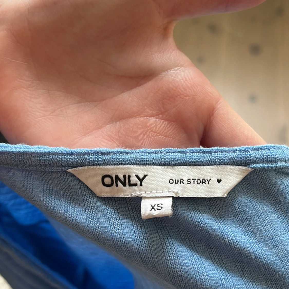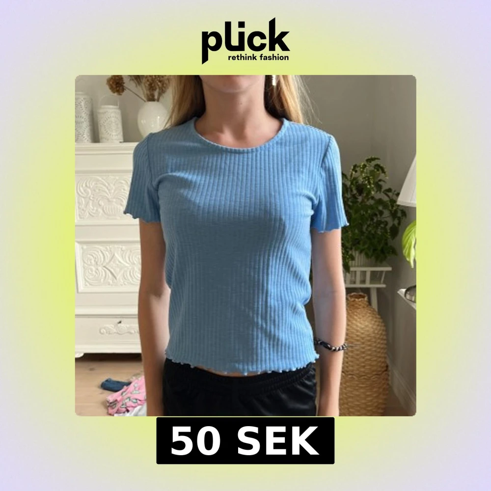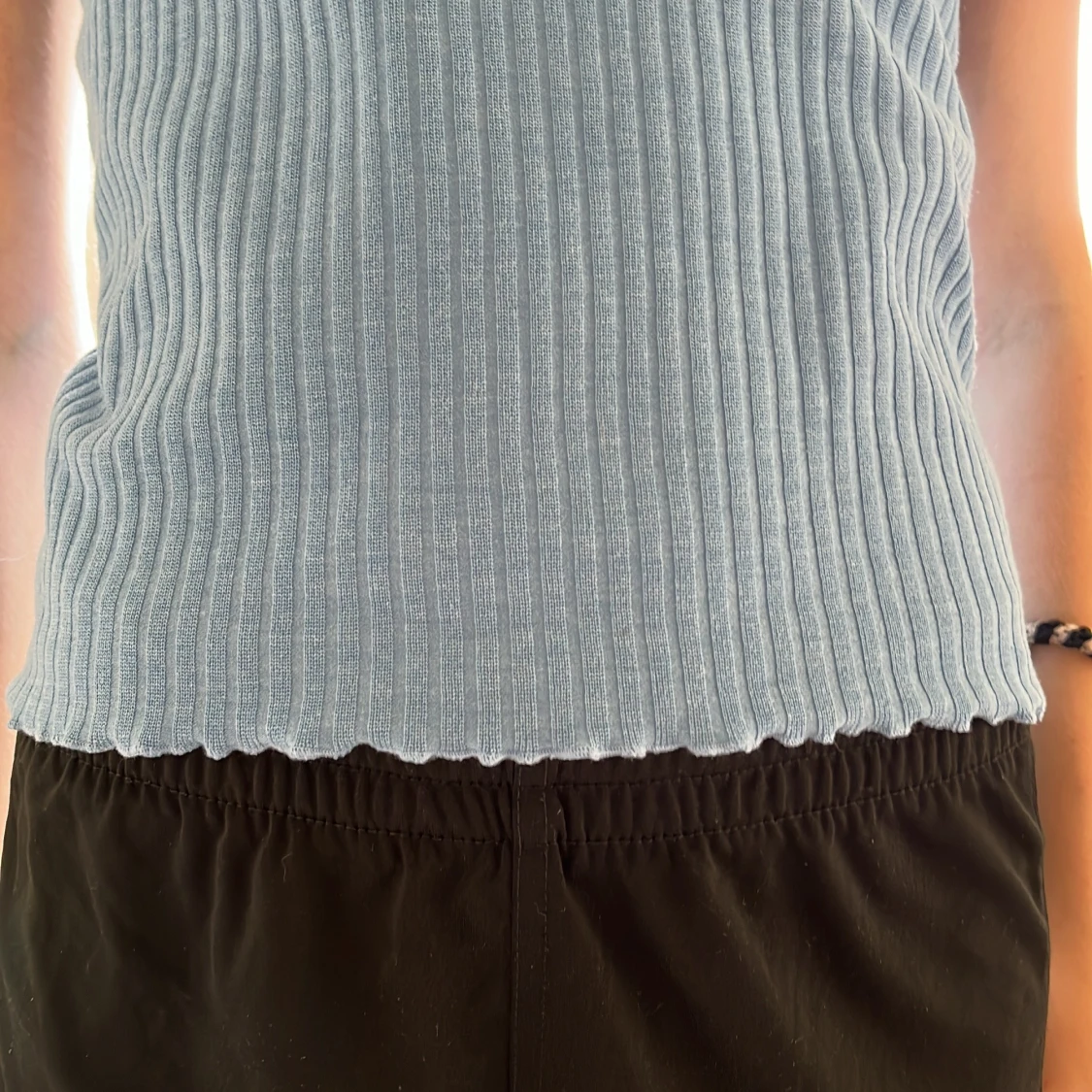 Superfin ljusblå ribbad topp med korta ärmar och rund hals. Toppen har vågiga kanter vid ärmslut och nederkant som ger en söt touch. Perfekt till jeans eller kjol för en chill och trendig look.