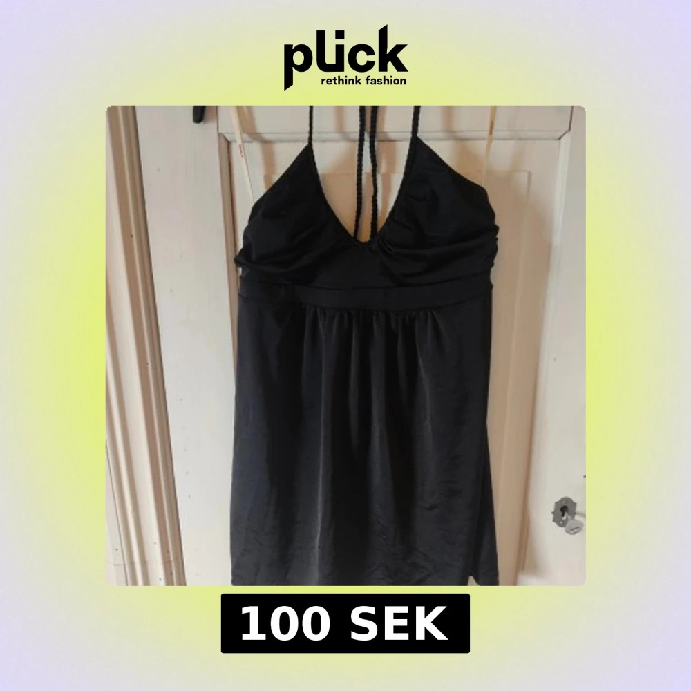 En svart topp/tunika med flätade band som går att knyta som man vill runt nacken så den sitter som en halter. Tröjan är av ett lätt glansigt tyg med mycket stretch.