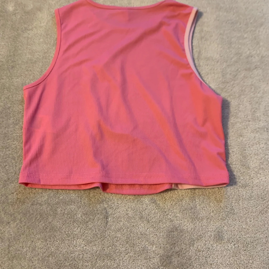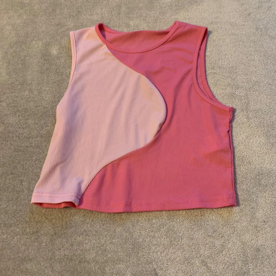 Säljer en cool och trendig rosa och ljusrosa ribbad linnetopp. Toppen har ett asymmetriskt mönster framtill och är ärmlös, vilket gör den perfekt för varma dagar. Den är croppad och passar bra till både jeans och kjol. Perfekt för sommaren! 🌸