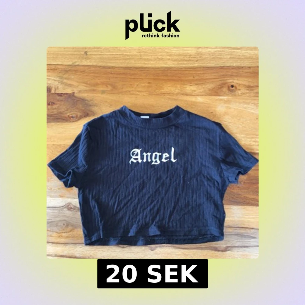 Säljer en svart croppad ribbad t-shirt med vit text 'Angel' på bröstet från shein. T-shirten har korta ärmar och rund halsringning. Materialet är mjukt och stretchigt, tillverkat av bomull och elastan.
