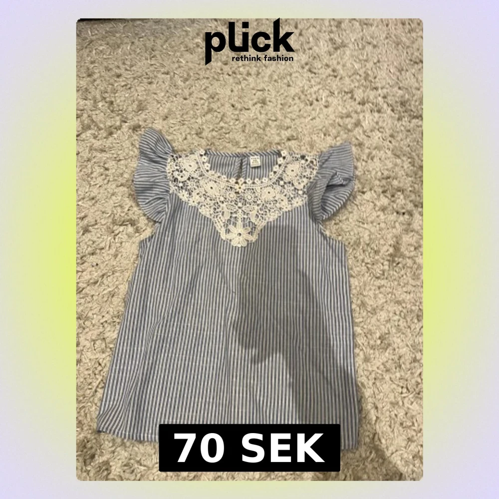 Säljer en söt blus från SHEIN i storlek 11-12 år. Blusen är blå- och vitrandig med volangärmar och har en vit spetsdetalj med blommönster vid halsen. Perfekt för dig som gillar romantiska detaljer och fräscha färger.