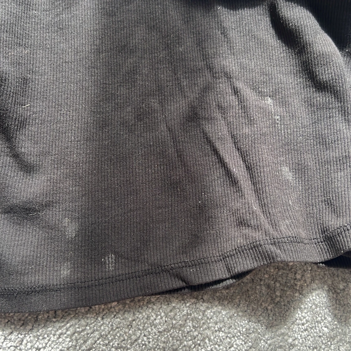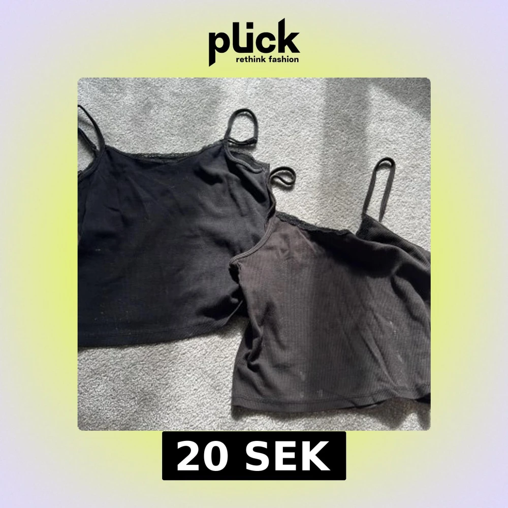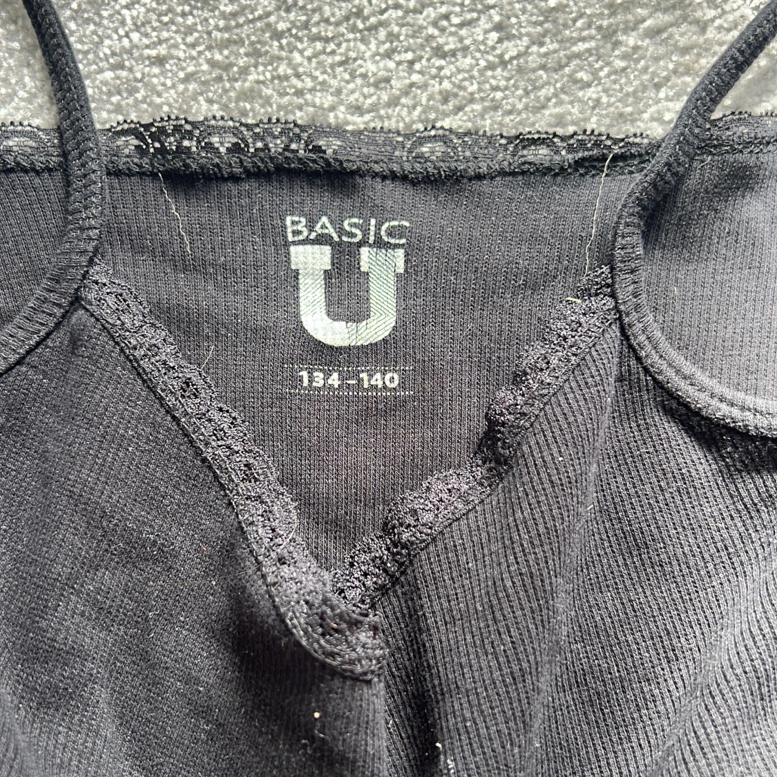 Två svarta croppade linnetoppar från Basic U med tunna axelband och dekorativ spets längs halsringningen. Materialet är ribbad bomull som ger en skön och stretchig känsla. Perfekt för att styla lager på lager eller till jeans och kjol. Lite smutsiga och slitna men fina ändå!
