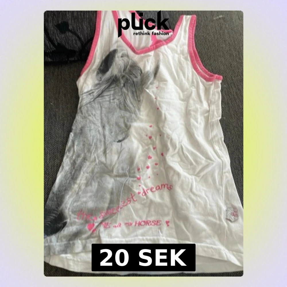 Säljer en vit linnetopp med stort hästmotiv i grått och texten 'the sweetest dreams' i rosa. Toppen har rosa kantband runt ärmhål och halsringning samt små rosa hjärtan som detalj. Perfekt för dig som älskar hästar!