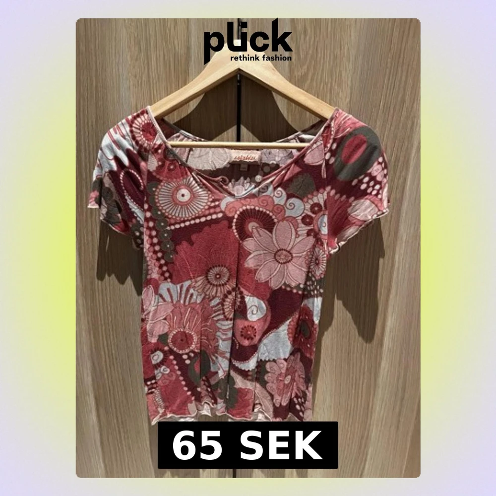 Unik topp från Rabaldur med blommigt mönster i vinröda, rosa och beige toner. Modellen har korta ärmar, rundad halsringning med knappdetalj och är gjord i ett mjukt, tunt material som känns skönt mot huden. Perfekt för dig som gillar färg och retrovibbar.