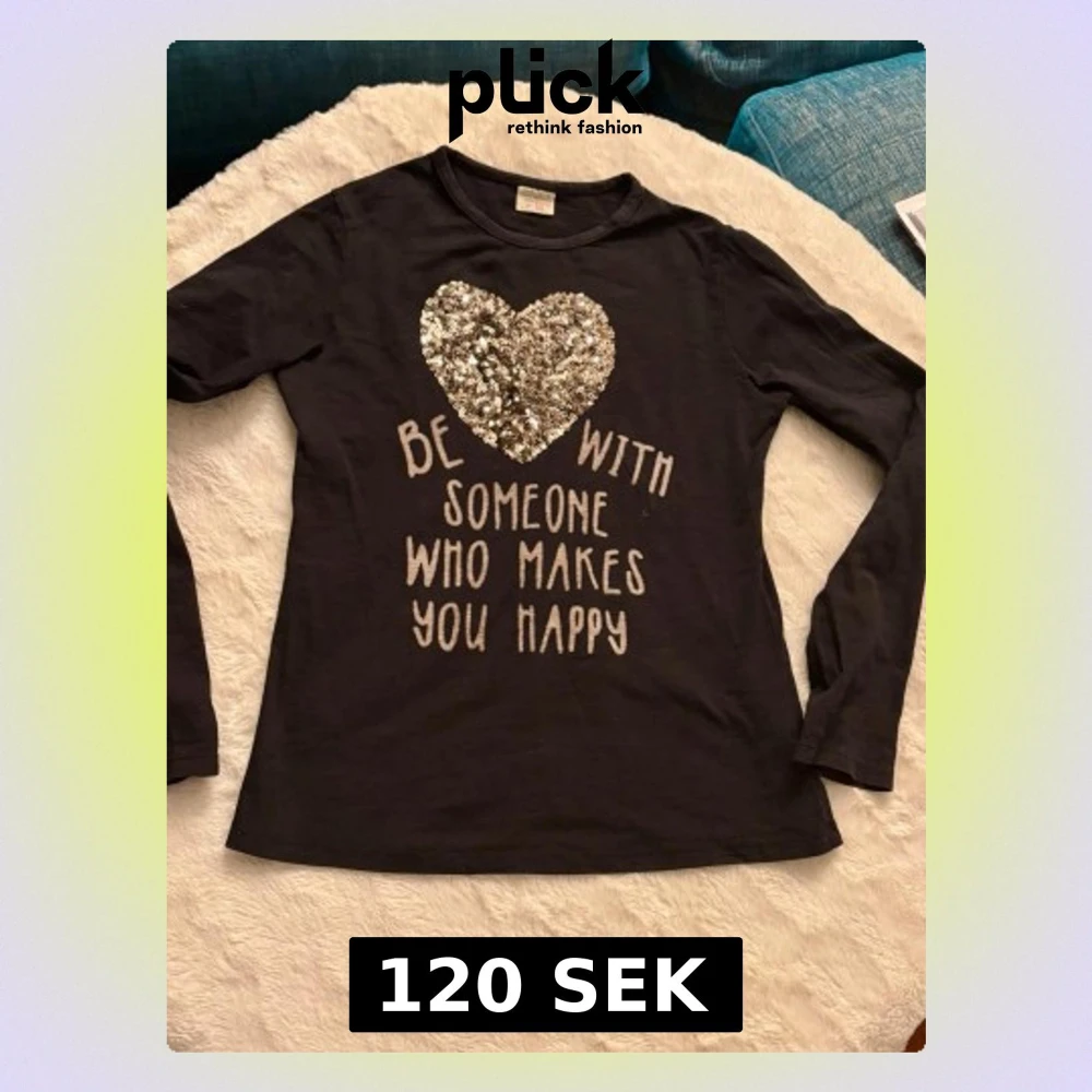 Svart långärmad topp från Zara Girls med ett stort hjärta i glittriga paljetter på bröstet och texten 'Be with someone who makes you happy' framtill. Mjuk och skön bomull, perfekt till vardags för dig som gillar lite extra bling.