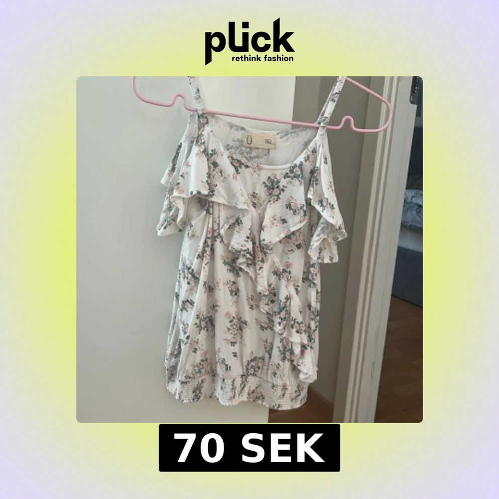 Supersöt blommig topp från Ü i vitt med rosa och gröna blommor. Toppen har smala axelband, volangdetaljer framtill, banden är inte justerbara🙌 Tröjan är använd några få gånger men det är nästan inga täcken på användning, pris kan diskuteras