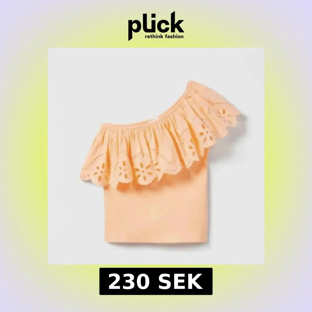 Superfin persikofärgad topp med offshoulder och bred volangkant med broderade blommor. Toppen är ärmlös och har en luftig, somrig känsla. Perfekt till jeans eller kjol för en chill look.