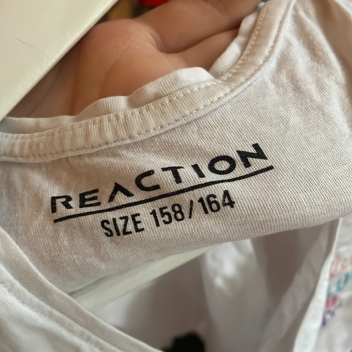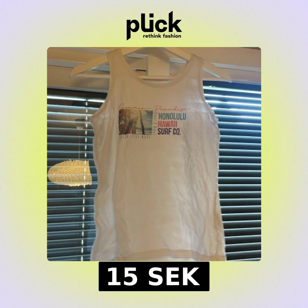 Säljer en vit linnetopp från Reaction med färgglatt tryck framtill som har texten 'Honolulu Hawaii Surf Co.' och strandmotiv. Perfekt för sommaren och strandhäng.