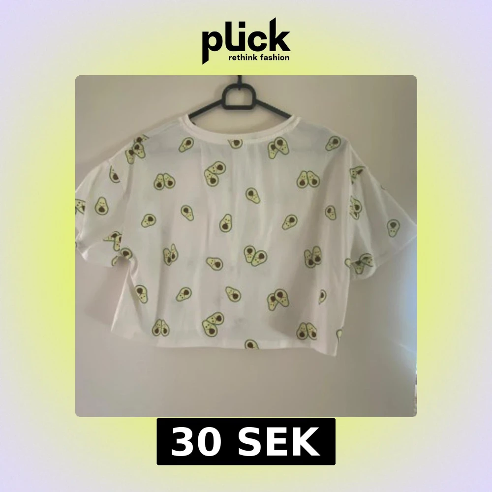 Säljer en vit croppad t-shirt från Shein med ett lekfullt avokadotryck. T-shirten har korta ärmar och en avslappnad passform. Perfekt för en avslappnad stil!