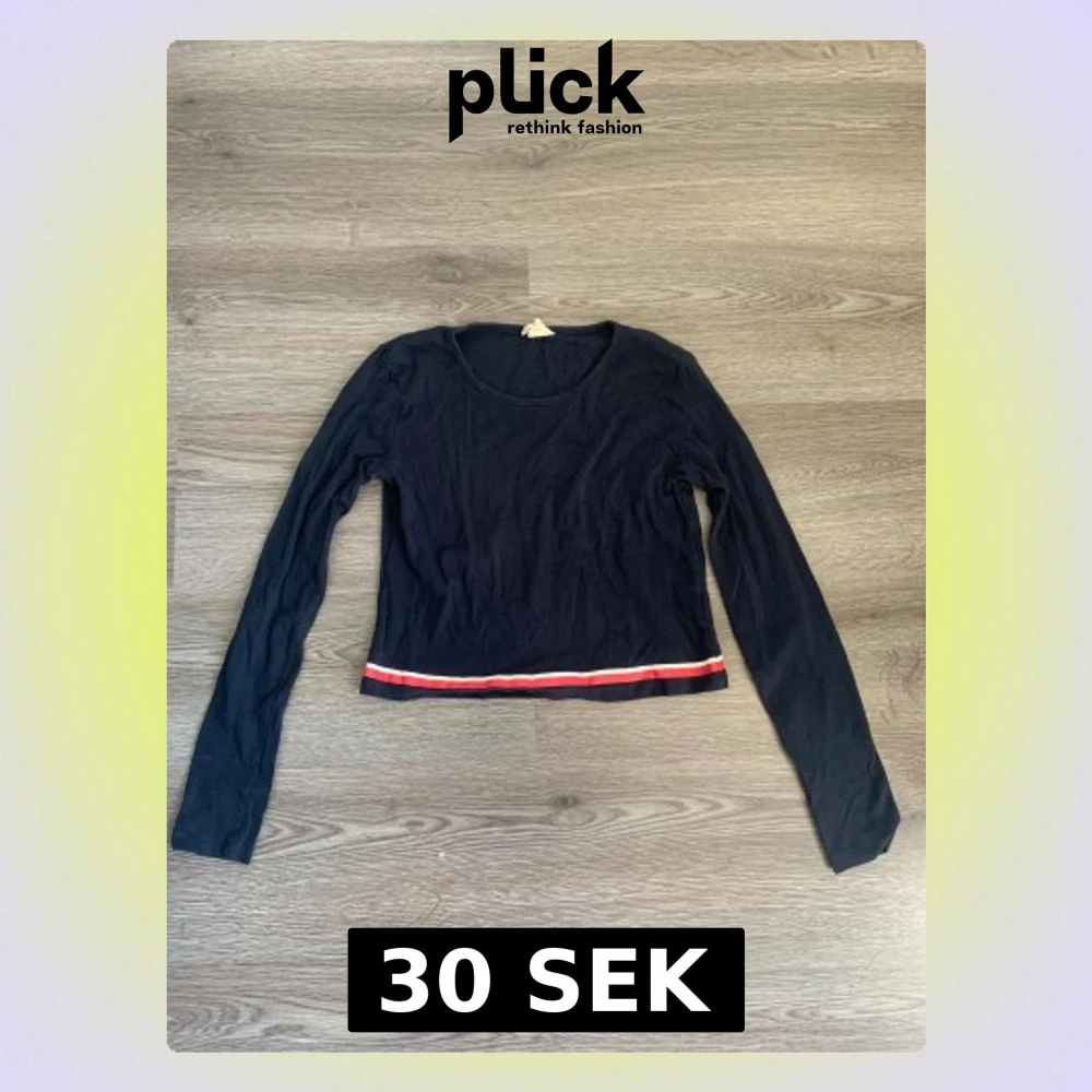 Säljer en mörkblå croppad långärmad topp i mjuk ekologisk bomull. Toppen har en rund halsringning och en snygg detalj med röd och vit rand längs nederkanten. Perfekt för dig som gillar enkel och stilren design.