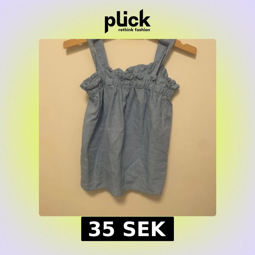 Supersöt ljusblå linnetopp med breda axelband och volangdetalj upptill. . Enkel och stilren design som är lätt att matcha med jeans eller kjol.