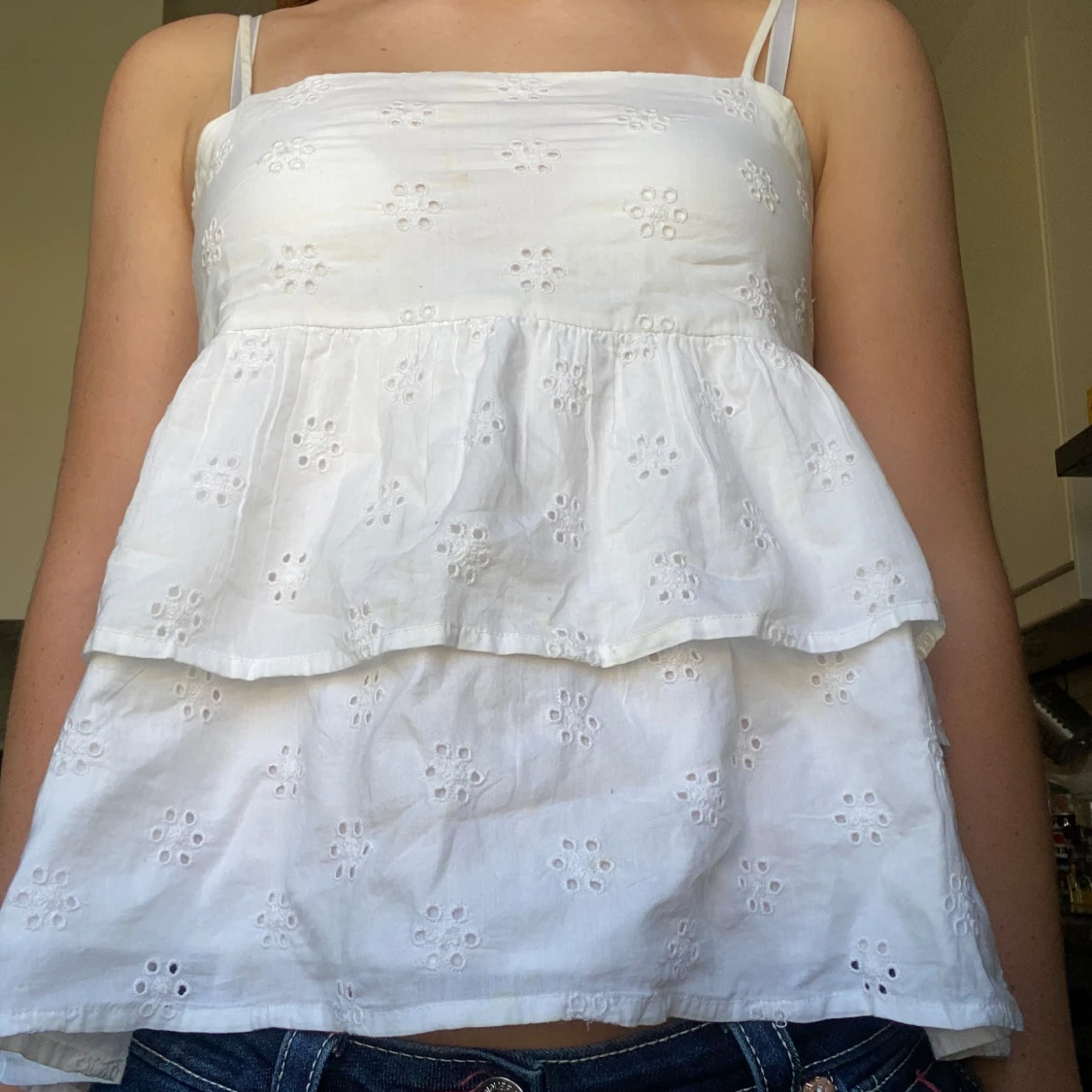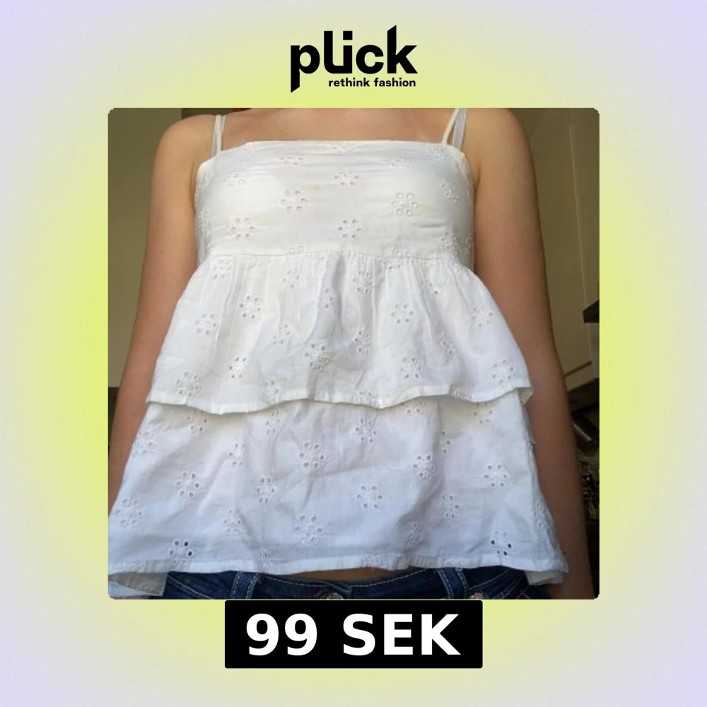Söt vit topp med tunna axelband, volang och broderade blommor. Luftigt och lätt material – perfekt för sommaren! Passar både till vardags och festligare tillfällen. Storlek 170 och i mycket fint skick, knappt använd.