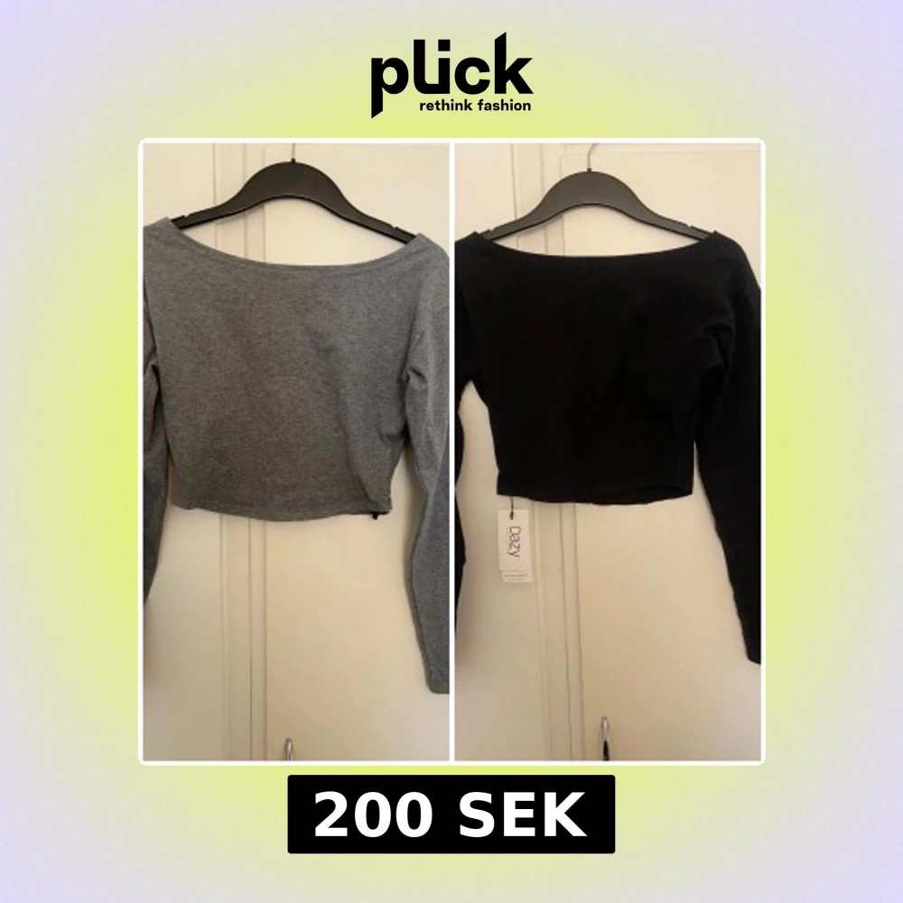 Två stilrena croppade toppar från Dazy, en i svart och en i grått. Båda har lång ärm och bred, något båtformad halsringning. Perfekta att matcha med höga jeans eller kjol. Mjukt och stretchigt bomullsmaterial som sitter snyggt och bekvämt.