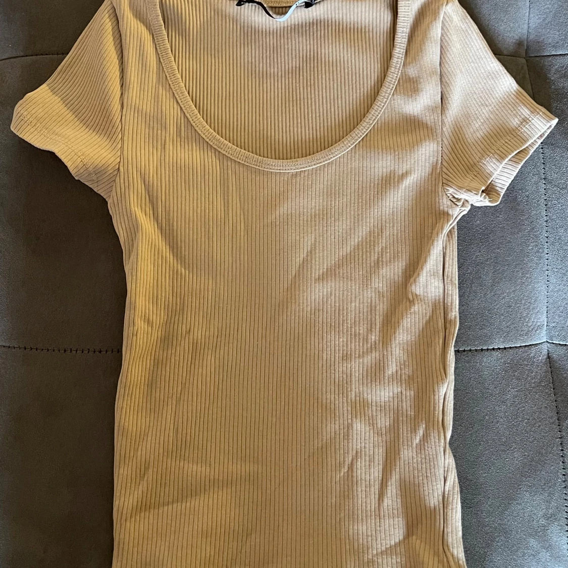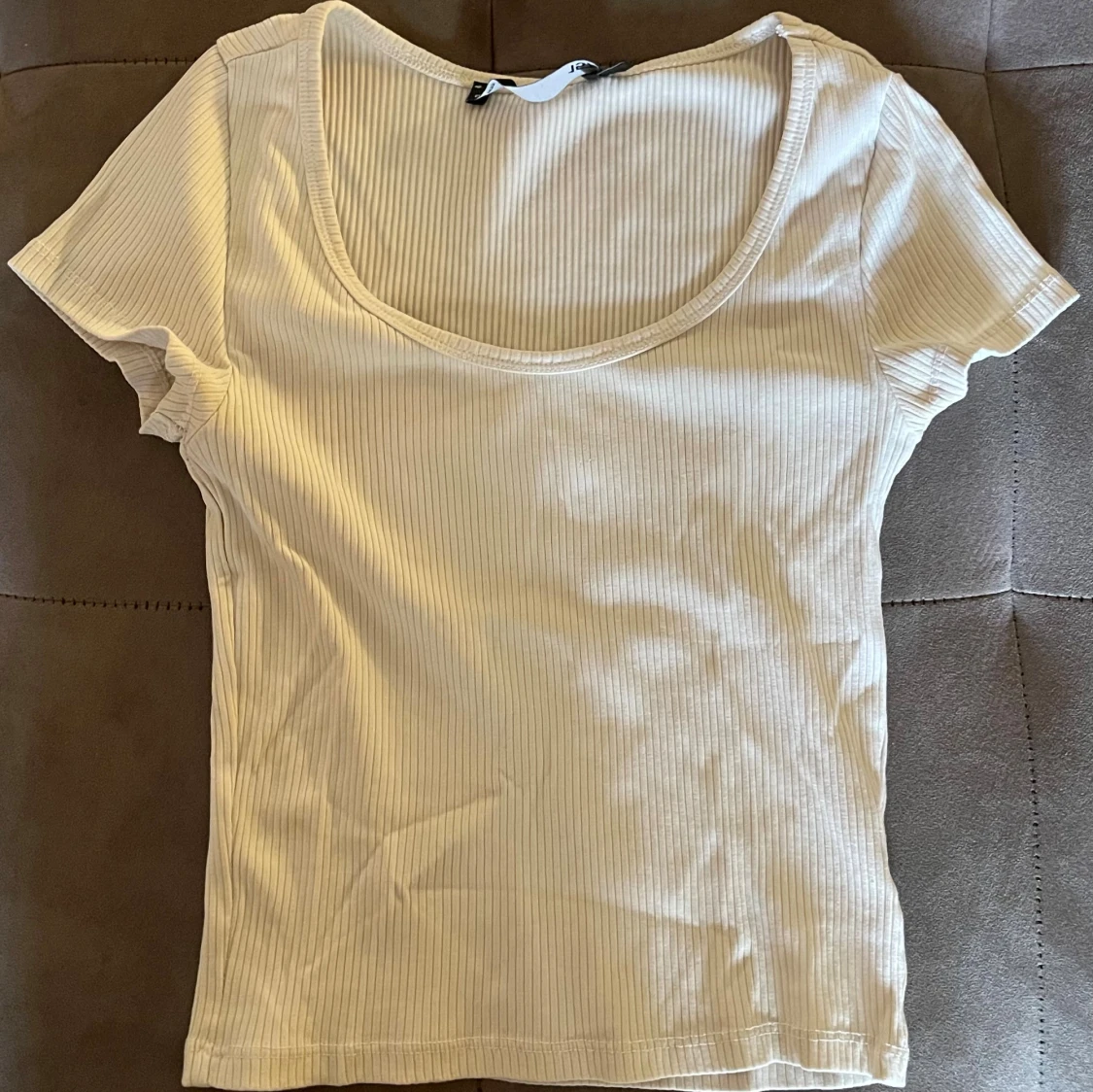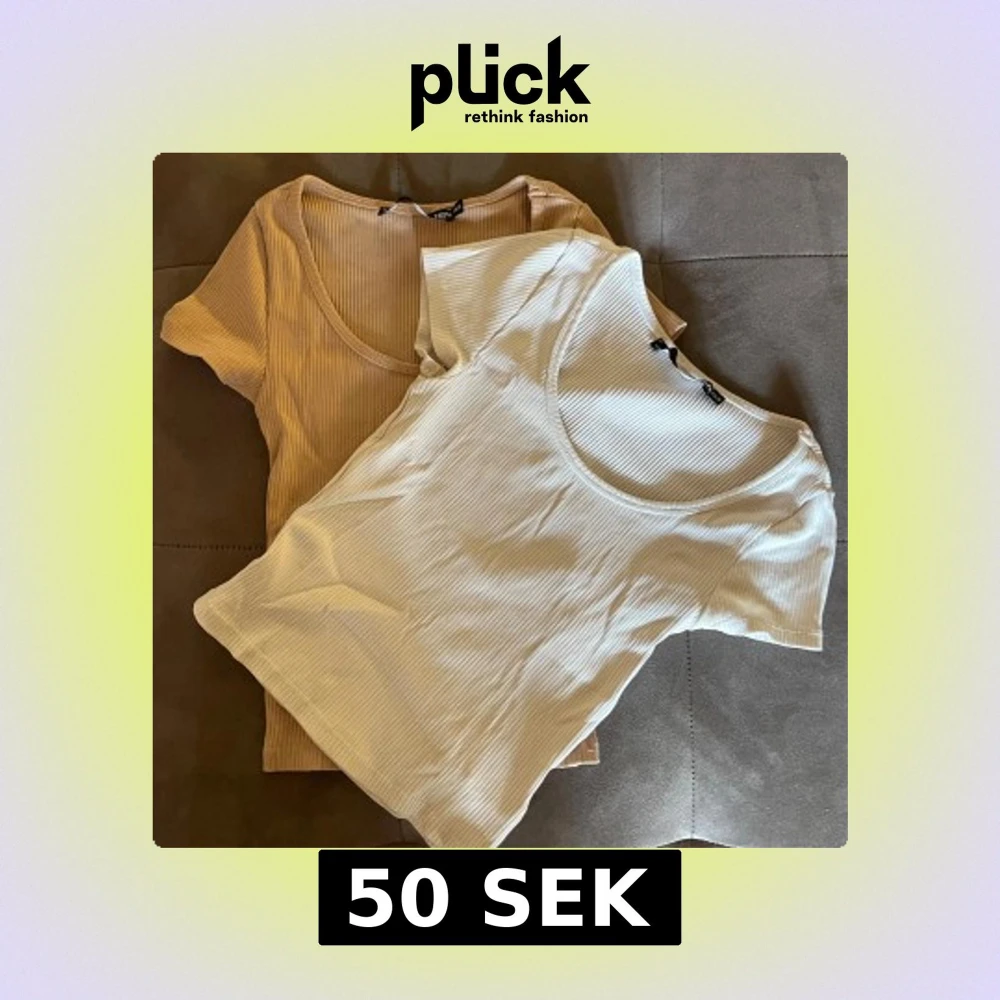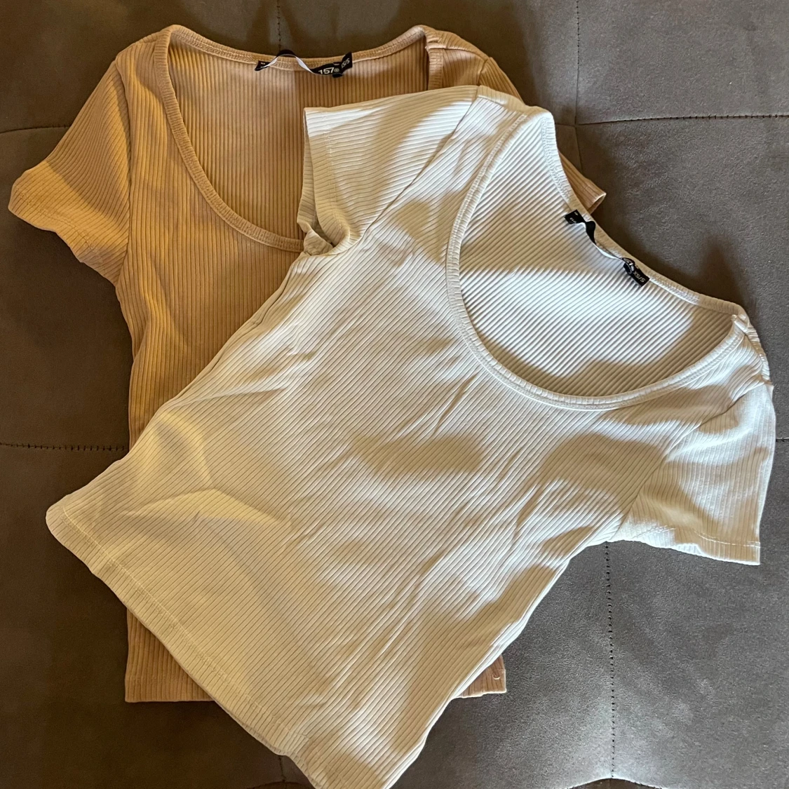 Säljer två ribbade toppar från H&M i storlek S. Ena toppen är beige och den andra är vit, båda med rund halsringning och kort ärm. Perfekta att matcha med jeans eller kjol. KÖP 1 för 50kr, båda för 80 kr. Priset går att diskutera!!!