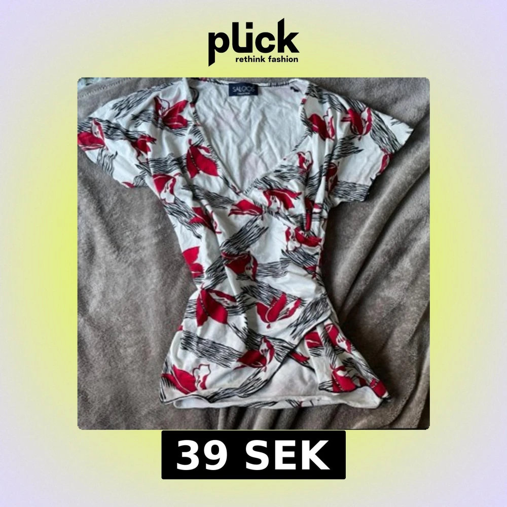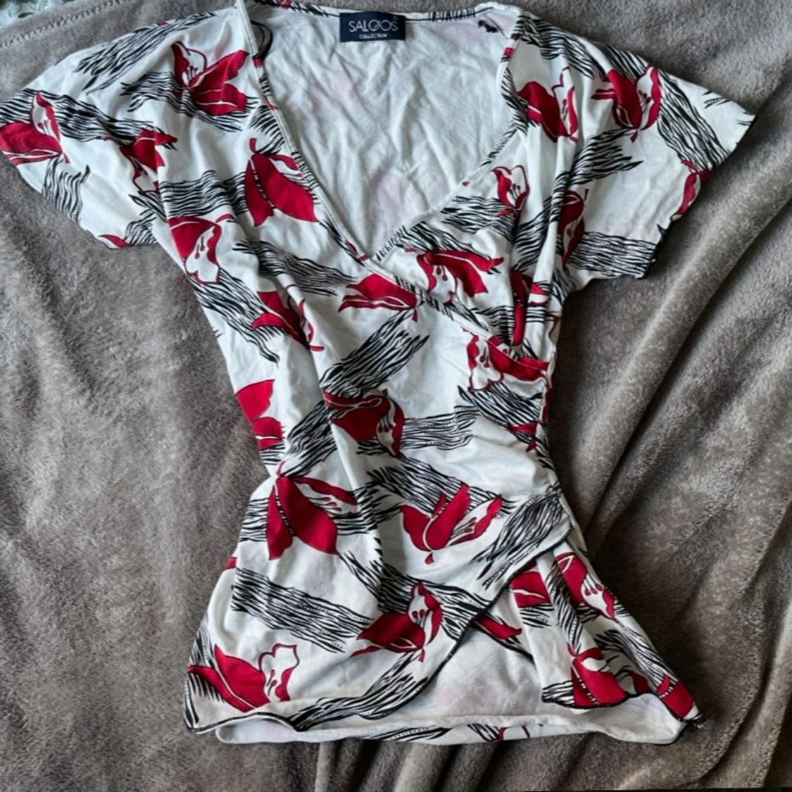 Supersnygg vit babydoll/omlottopp top från Saloos med röda blommor och svarta grafiska detaljer. V-ringad och kortärmad, perfekt för vår och sommar. Tunn och skön, passar till både jeans och kjol. Sjukt gullig men inte riktigt min stil! Skulle passa dig som gillar y2k stilen :)